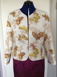 A new favourite maybe. The butterfly material was bought at the show at the NEC a couple of weeks ago, and the lining is a luxurious paisley pattern (not bought at the NEC). The hardest part was working out how to cut it out so that I had complete butterflies at the front. I could have bought metres of material and tried to get matching patterns all the way round, a la S/S 13, but I am not really sure that it would have been worth it. Splattered butterflies works ok. And it was such a joy to work with cotton again – it cuts easily, sews easily and presses where you want it to stay. It will crumple when it travels, but I will get to like it crumpled. It will be like real butterfly wings!