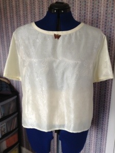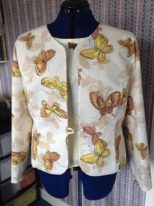 Made from lining material left over from making the butterfly jacket. Hence the small butterfly embellishment. The pattern said ‘very easy’. Two hours to make. It took me about twice as long. The most difficult part was adjusting the pattern to ensure that the top went nicely underneath the jacket, which meant adjusting the neck line and associated pattern bits. Then, as the material is very prone to fray, all seams had to be French, which of course means approximately twice as long to make! At the back it fastens with a small rouleaux loop and a button the same as fastens the jacket. The paisley pattern makes the top plain, but not totally simple. It should go with lots of other outfits, as well as the butterfly jacket.
