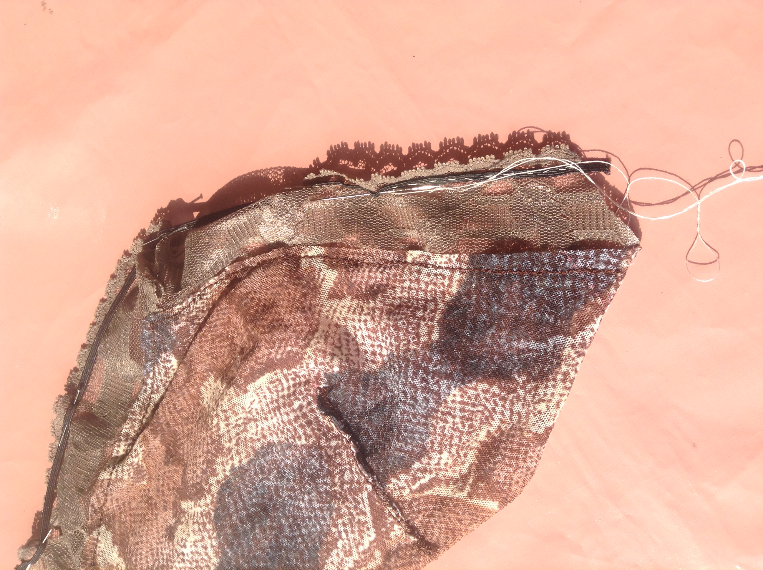 Here I am making sure that the two bra sections line up and that I a pinning on the lace such that it folds the same way at its highest point.
