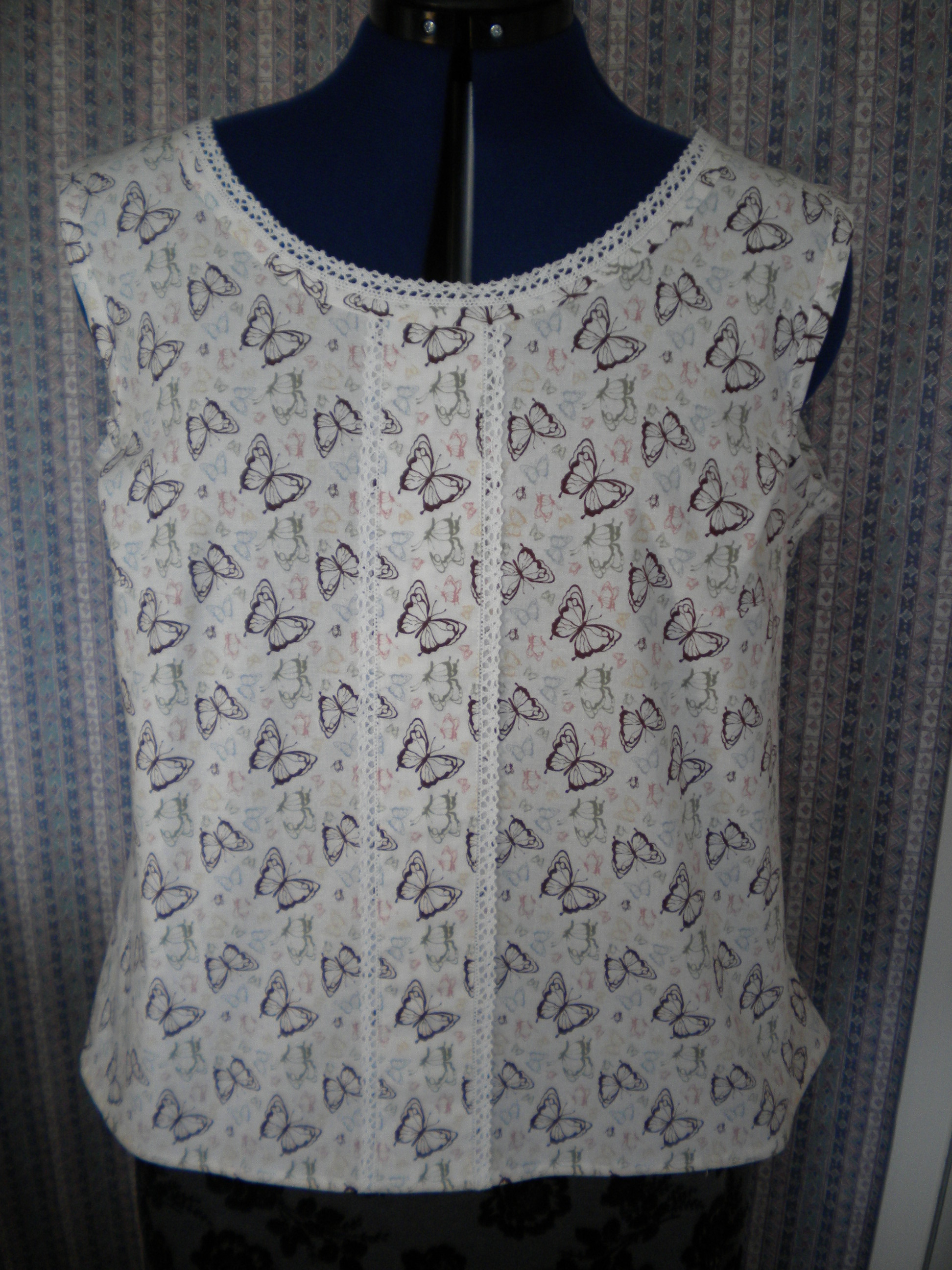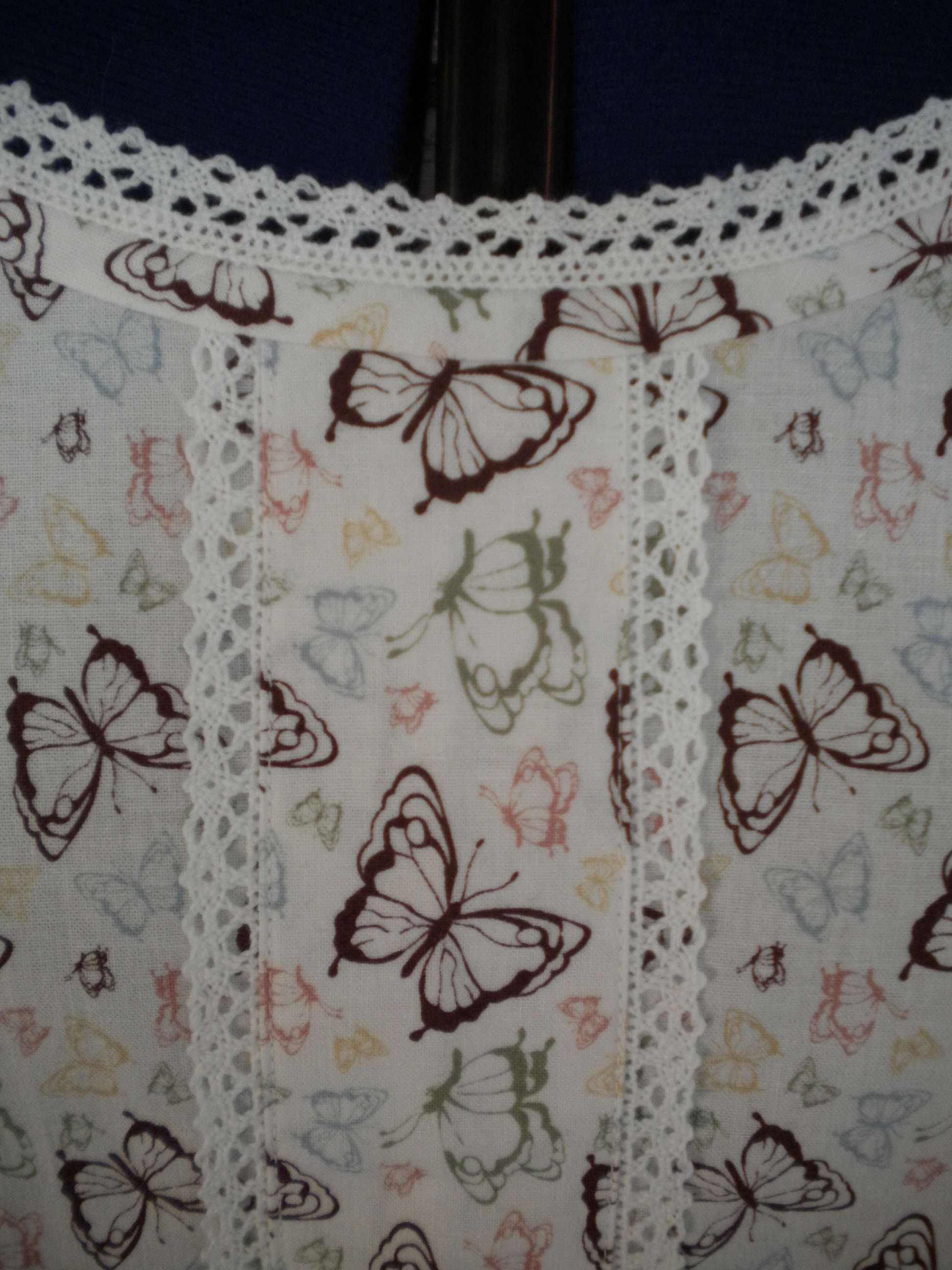 I used the pattern that was free to download from Love Sewing Issue 4, but didn’t apply the narrow tucks as suggested. In fact, I think I have made it as per the original design. I’m pleased that I did as I have a straight line of upward facing butterflies right down the front, which is just right. The fun was in working out how to embellish it. Eventually I used some narrow lace purchased on the market, both on the edge of the fold and around the neck. I debated about the neck line. The lace was pinned in place on my dummy for over a week, and eventually I opted in favour and sewed it in place with a very slow and careful machine stitch. I also opted to make my own bias binding; something that I have now done several times. As with one or two other simple techniques, how did I ever manage without knowing how to do this? So the lovely blue binding that i bought at Guthrie Ghani can wait for another project. There is spare fabric. I think I know what it is going to be.