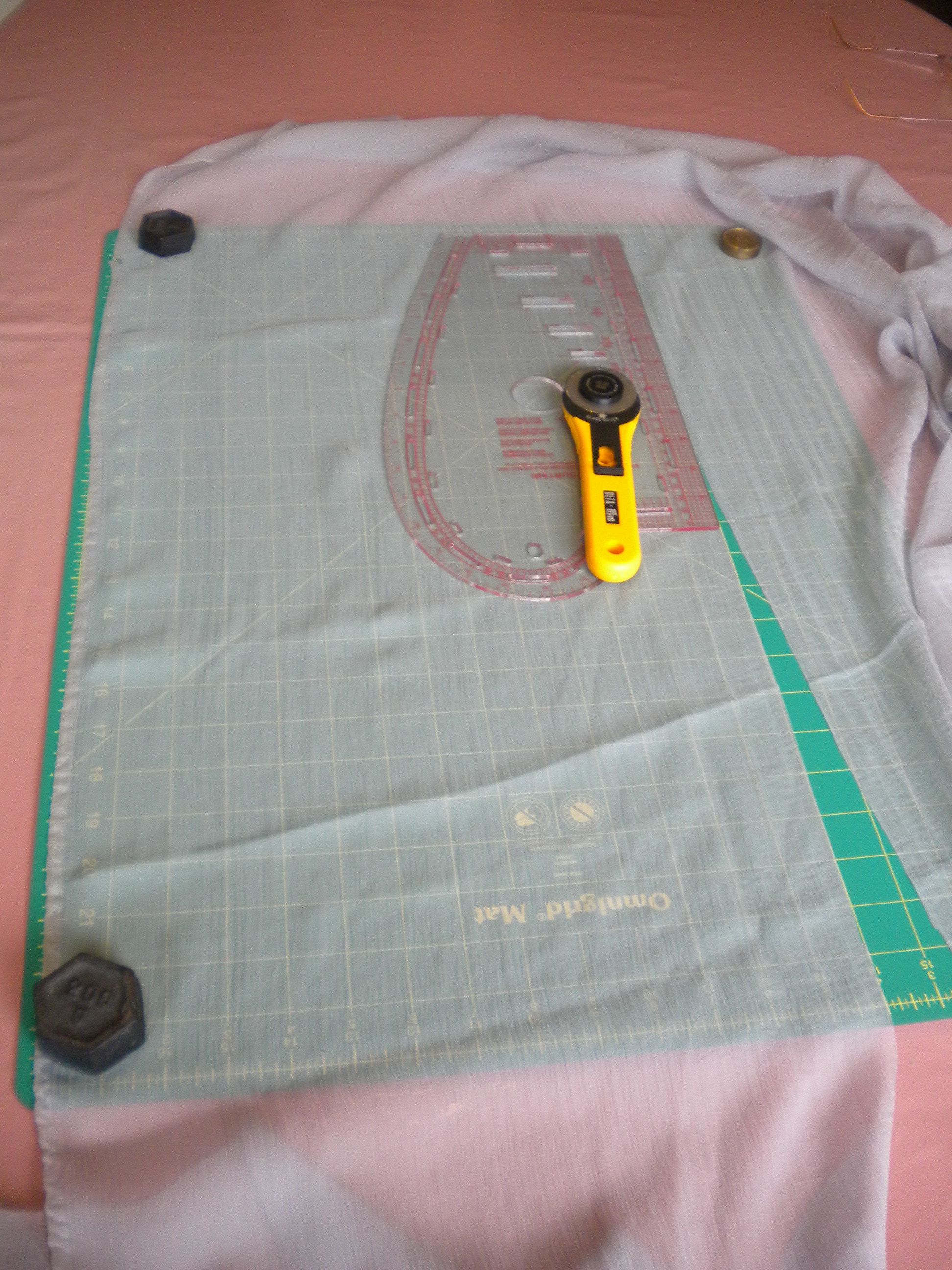I also went out a purchased a rotary cutter and mat to help me get straight edges. I’d been considering the idea for a while and this seemed like the right time. So armed with weights, which haven’t been used for weighing out ingredients for years, a ruler and my cutter, I set about cutting the silk into scarf widths.