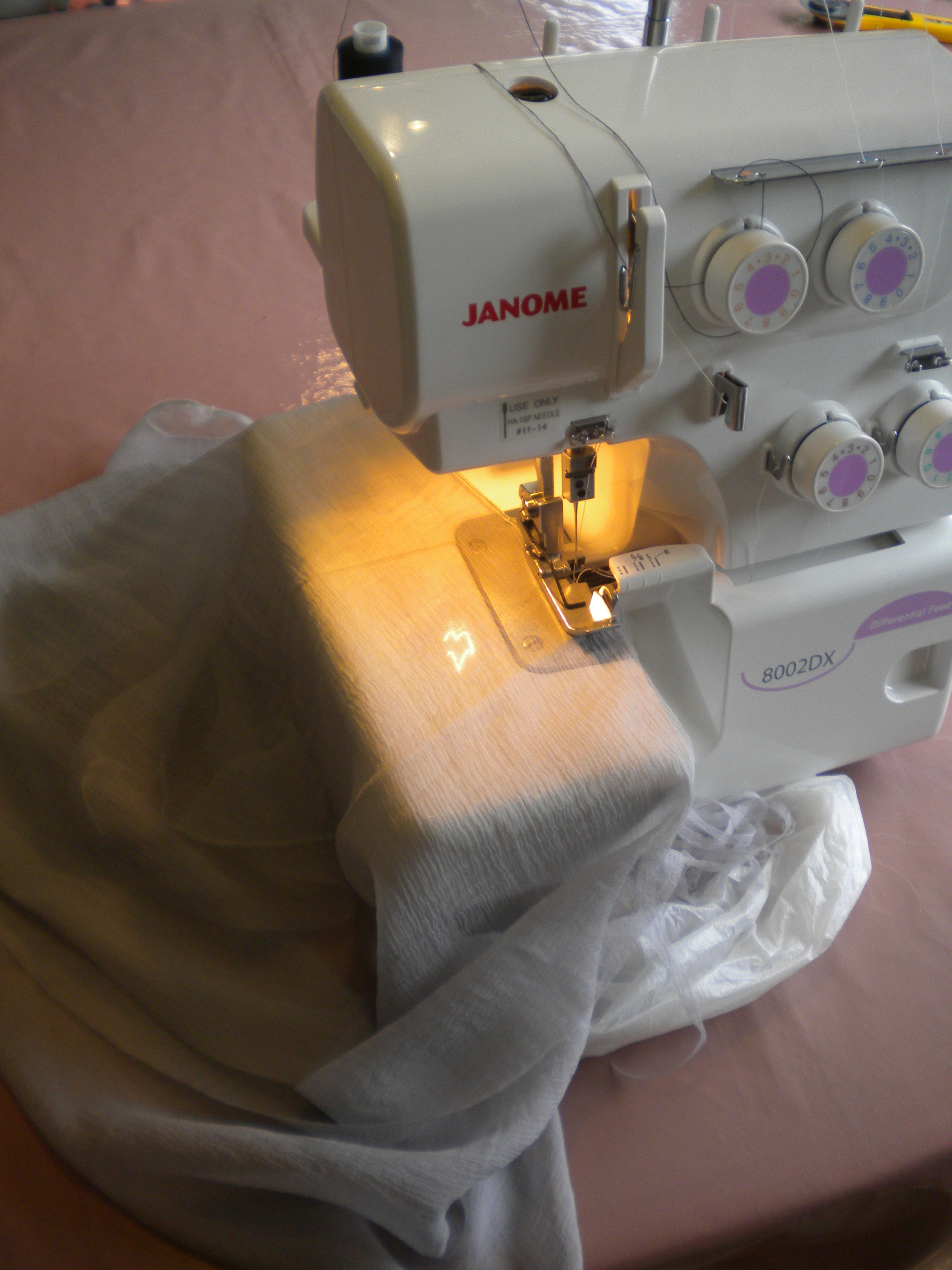 Its the first time I have used the rolled hem function on the overlocker, so I did a bit of practicing, on some equally fine fabric. The test seemed to be OK, so off I went with the real product.