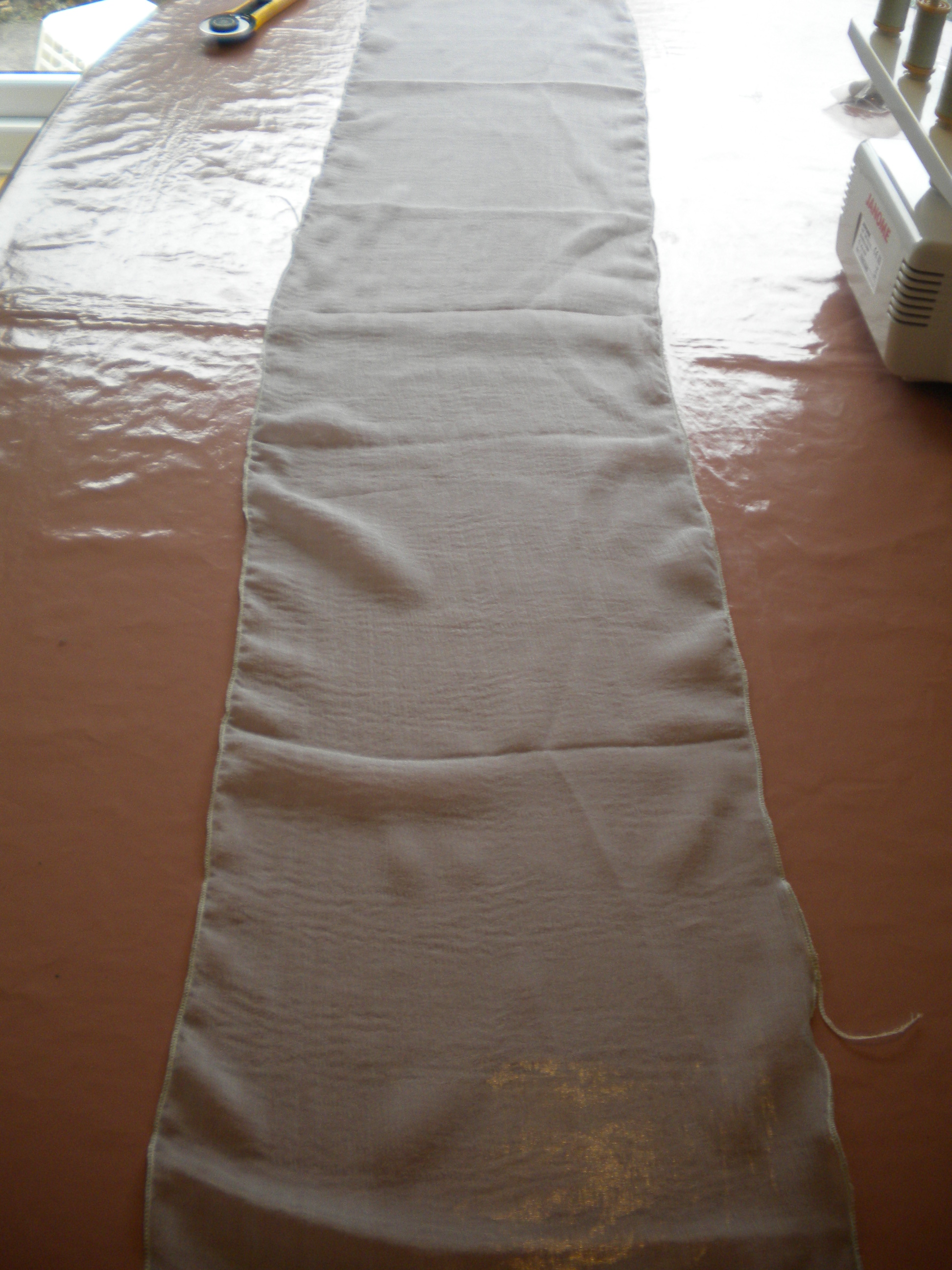 Stitching the two sections together was so simple in comparison. To divert a little from the theme, I once made an organza ball gown for a student ball; it was the late ’70s, and there was loads of fabric and quite a lot of flouncy stuff! I tacked everything to tissue paper before I sewed. So that’s what I did this time as well. I laid each scarf out on the table, got them lined up approximately straight, and tacked them down the centre adding tissue paper. I was then able to whizz a straight stitch down the scarf on my sewing machine, and then gently rip back the tissue paper after sewing. No problems. But I can’t see how you could do the equivalent with an overlocker. Again, all feedback gratefully received!