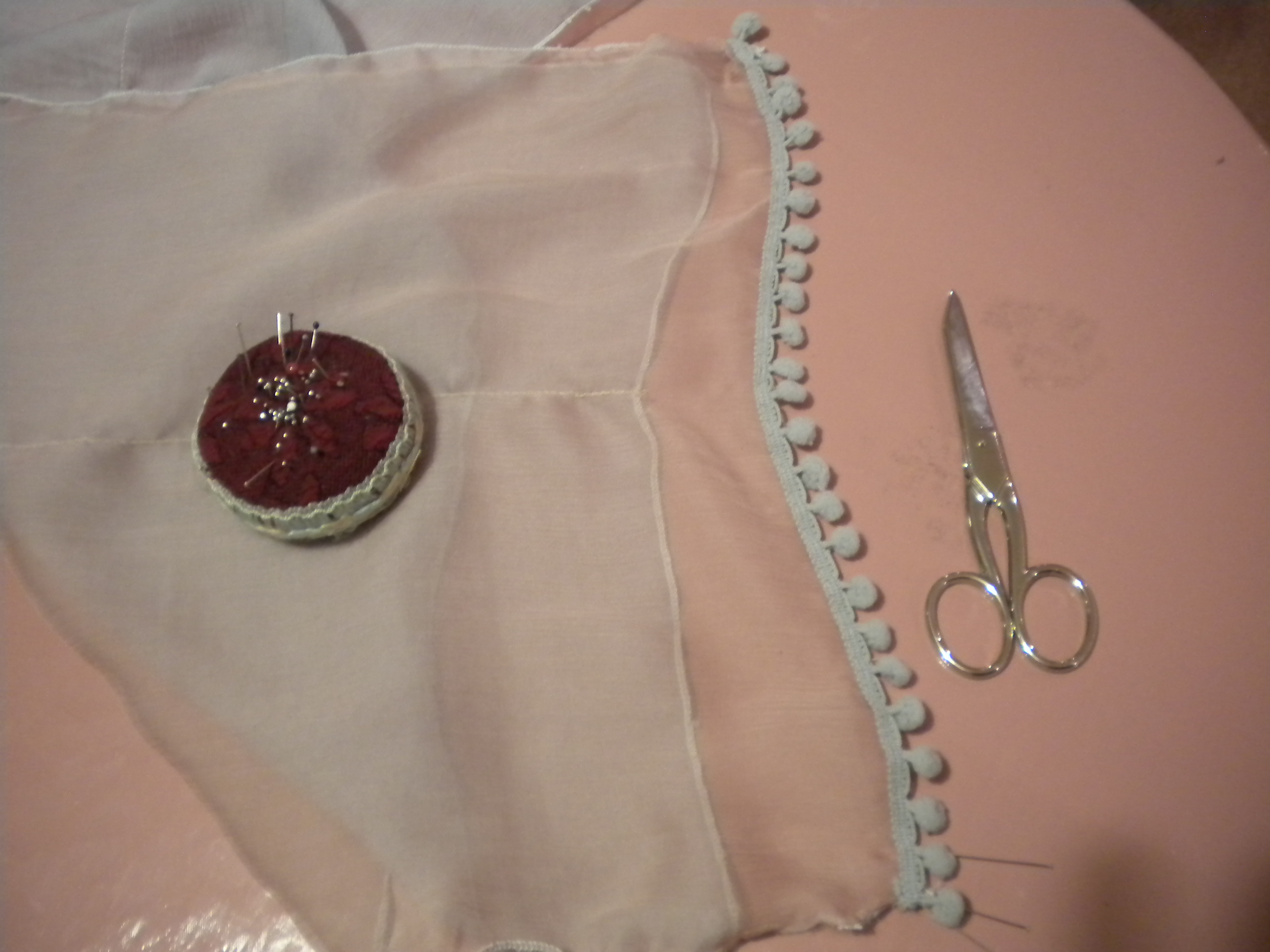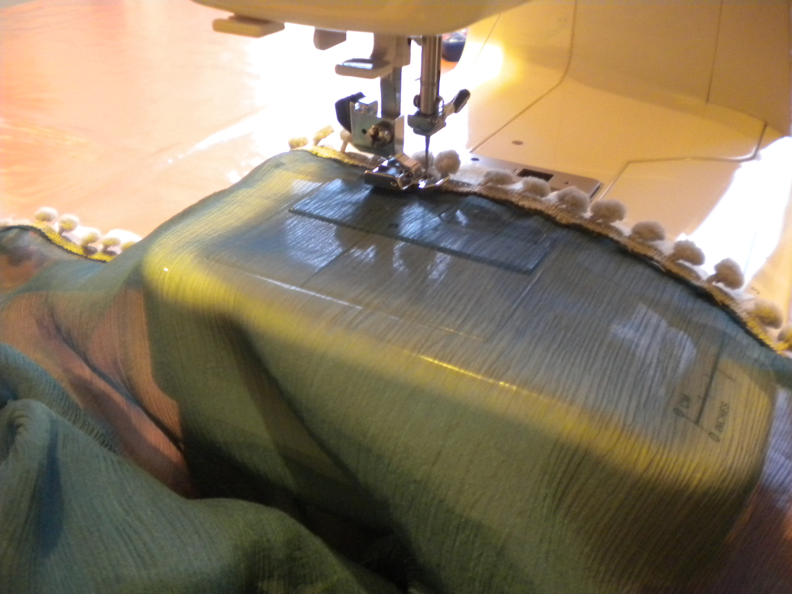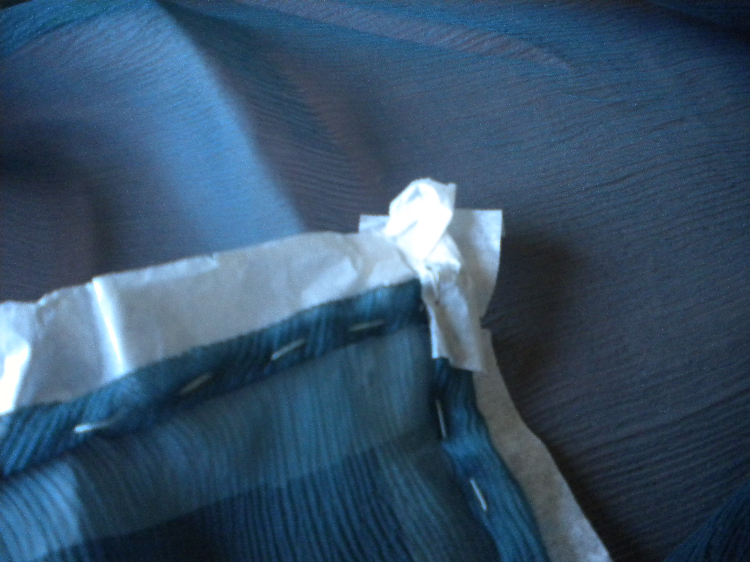 You can see that the plan was to roll a not- so-narrow hem, manually, and tack the hem to the tissue paper. Ideally this process requires about 4 hands: to roll the silk and keep it in place, to hold the tissue paper in the right place, to pick up the needle and catch the silk before it unravels, and occassionally, to check that you haven’t caught any of the rest of the fabric in the stitch. The latter problem happened about 4 times, but the other problems happened every few stitches. I nearly gave up about half way down the first side, but sewing teaches me patience and perseverance, both in large bundles in this case. Then having stitched 128″ worth of tissue paper to silk, I started all over again stitching the trimming in place. This was a little easier, as long as I didn’t get the thread caught round bobbles or pins.