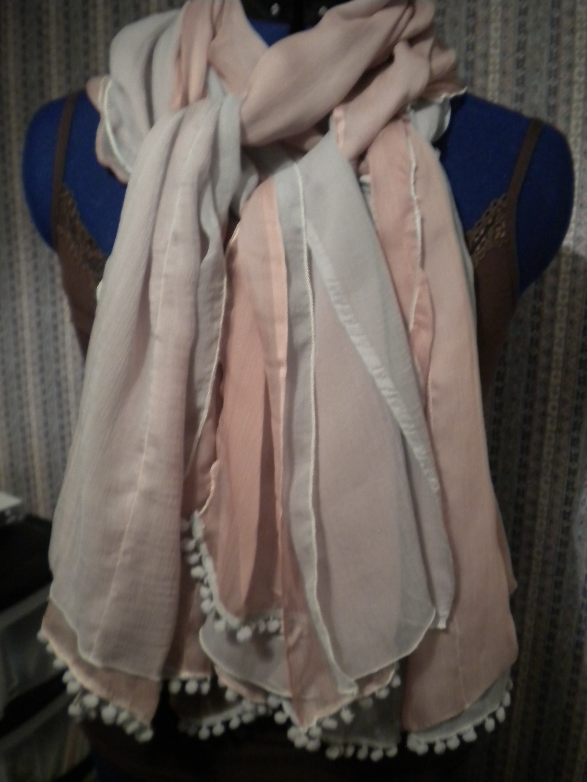 As I have said already, in places the scarves look messy, as there are so many places where I have had to thread in the ends part way down a seam. I had already planned to add some bobble trimming, but I added more than I intended, and all by hand. Oh, and the two scarves were never intended to be exactly the same length. That part is ‘by design’ rather than anything that I can blame on the overlocker!