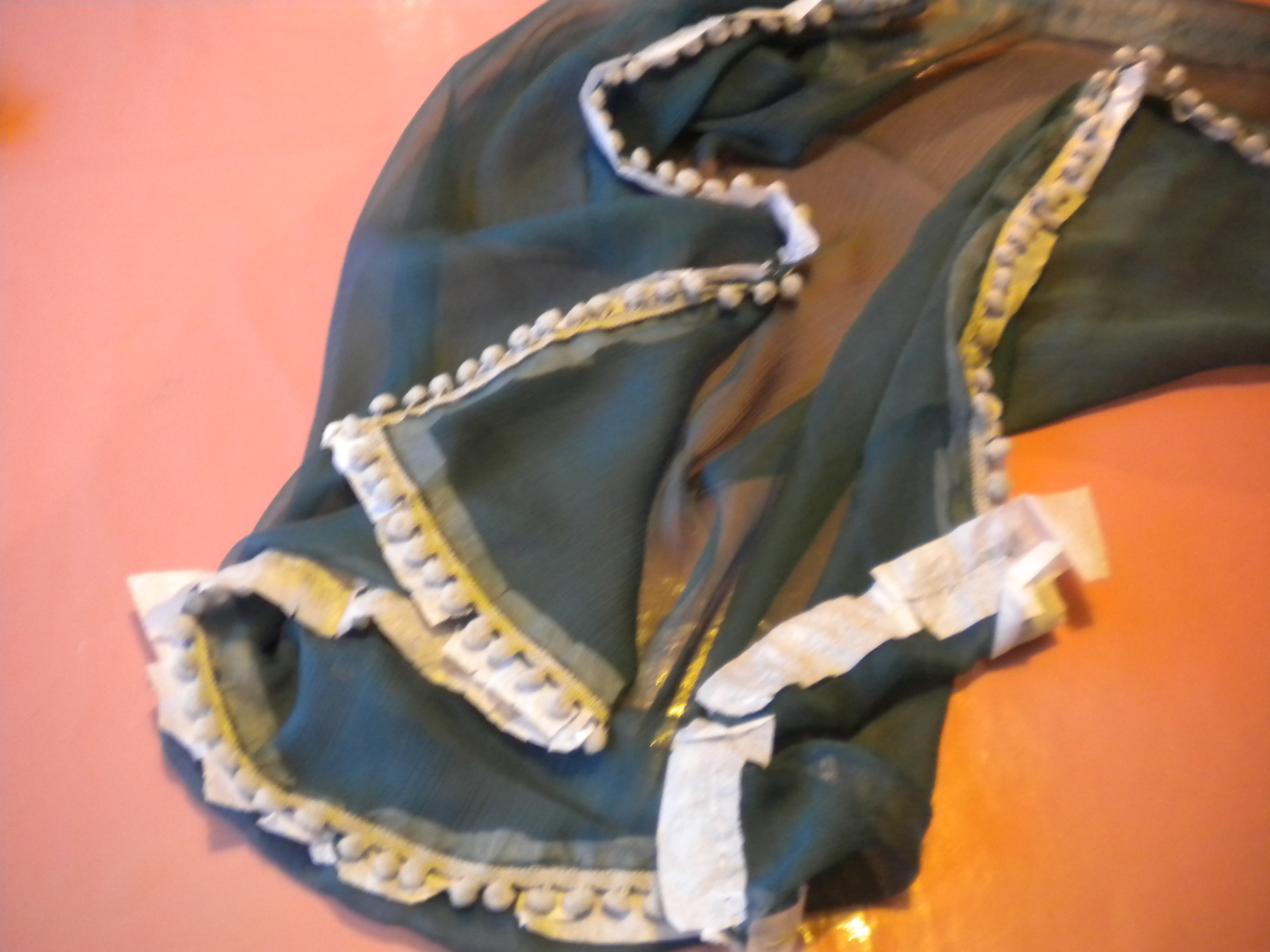 Then this was followed by another 1,5 hours pulling out two lots of tacking stitches and removing all of the tissue paper, which was particularly difficult in the corners, and between the two rows of machine stitching. What a mess on the floor, but I got there. I wonder how much this would retail for in the shops, after about 4 hours effort? I shan’t be looking see how much it costs to buy a silk scarf with bobble trimming…..