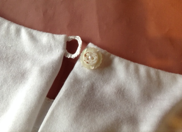 I also pondered the back fastening. Firstly, having made the t-shirt in jersey, it probably doesn’t need one, but I followed the pattern and finished the neck with bias binding. The pattern also asked for a bound loop, which I haven’t done for years, and had no suitable white thread. I attempted a rouleaux loop from some white satin binding that I had, but it was going to look messy when attached, so I re-thought, and eventually went out and purchased some white embroidery thread.