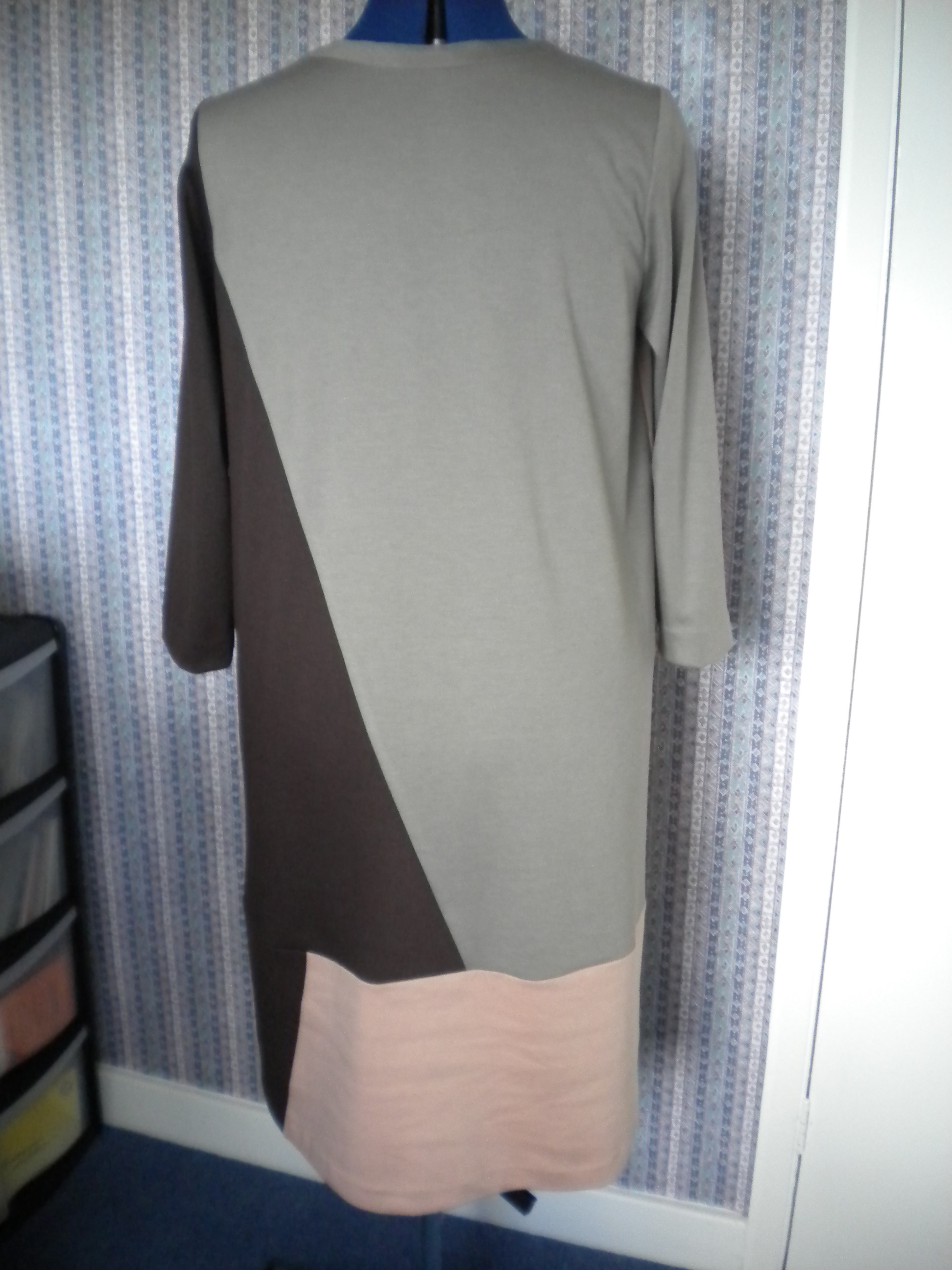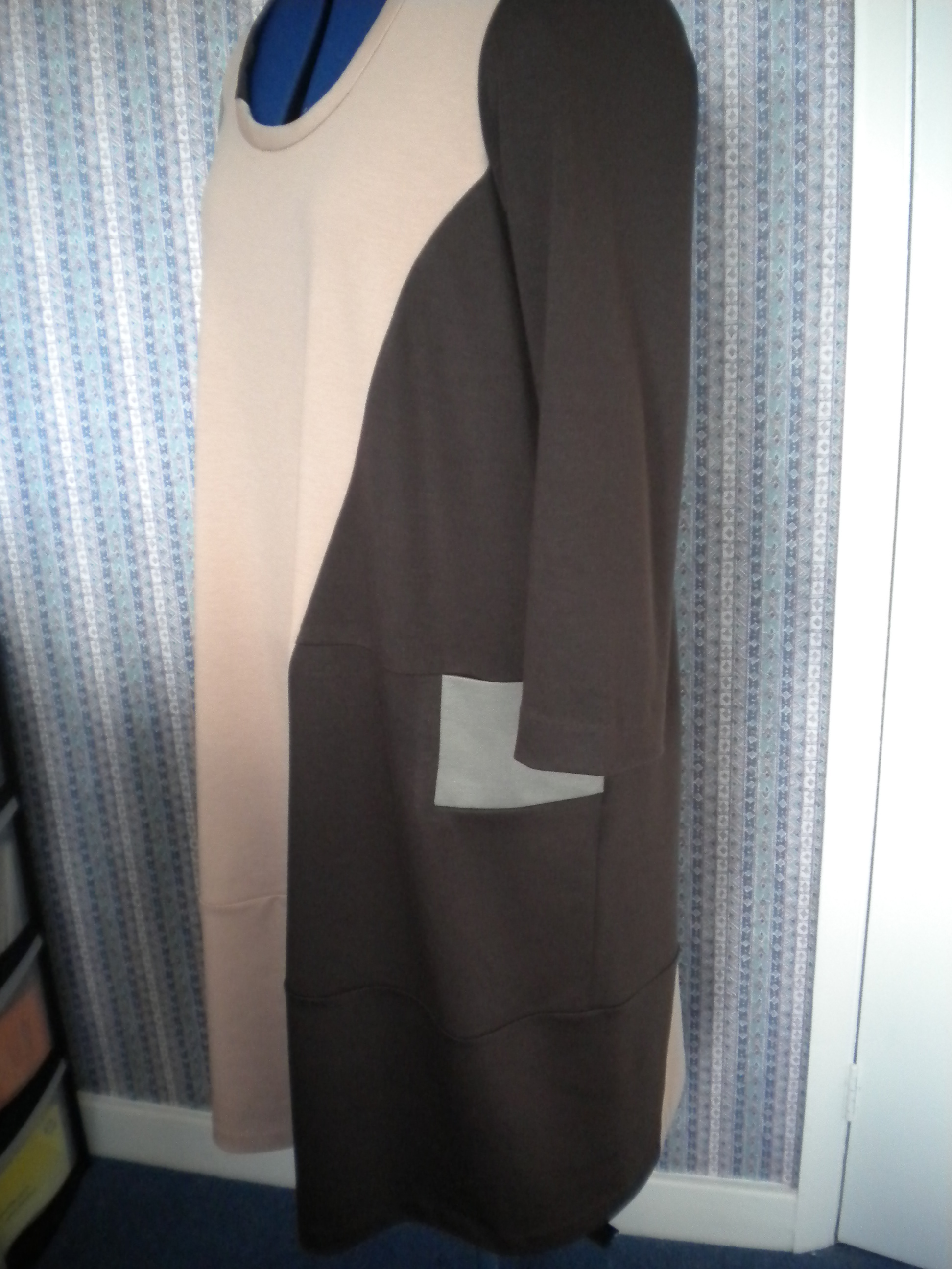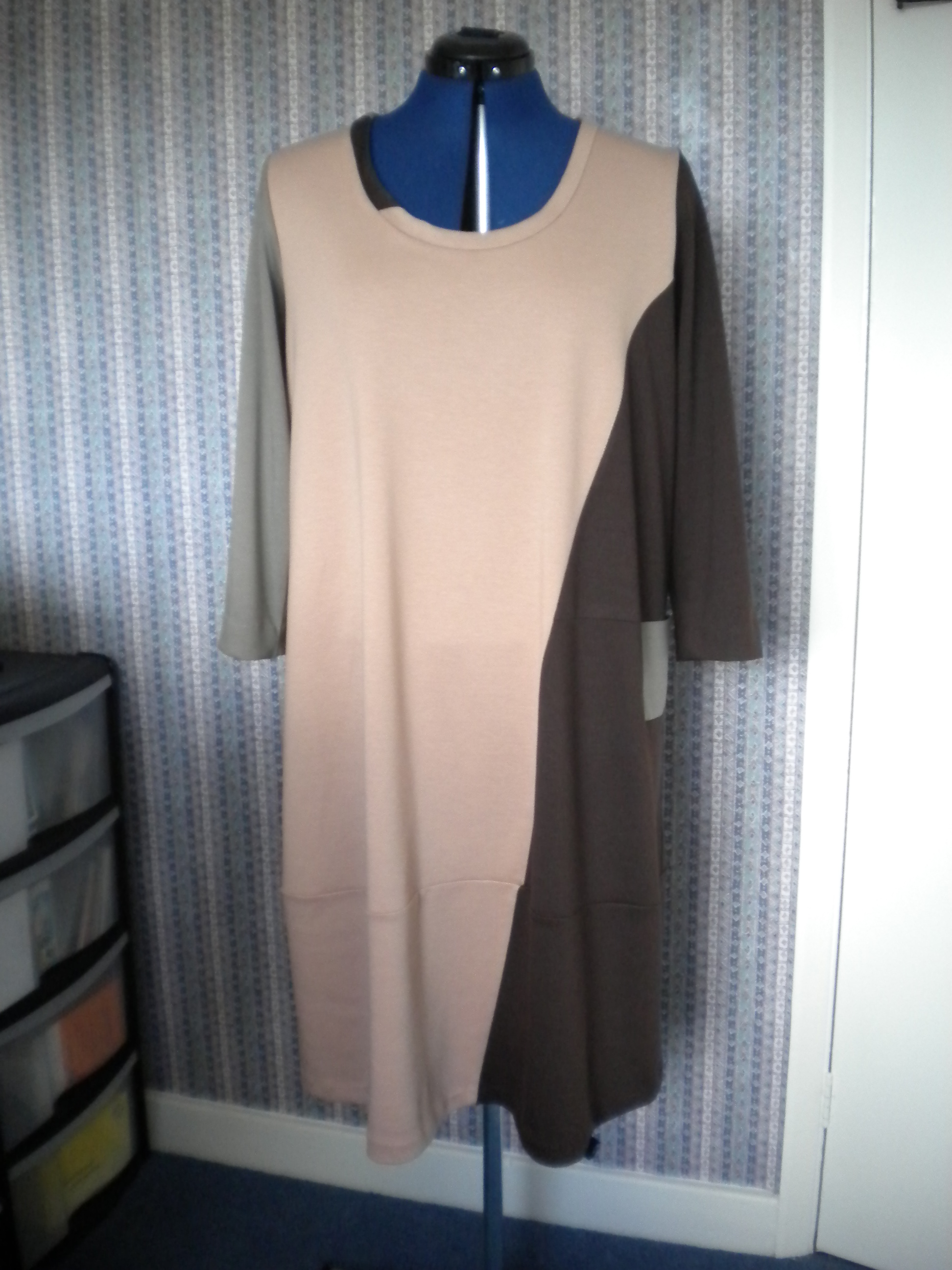 But will I use the pattern again? Maybe not. I’m not sure that a wardrobe needs more than one of this dress. There are a limited number of places where I can wear it, and a very limited number of coats / jackets that will work with it. Although I have shoes that will work with it, I can’t walk far in the shoes, so that will also limit its usability. There is a matching cardi with the pattern. I nearly bought some brown fabric this afternoon to make the cardi, but then I didn’t. Again, it will be a huge challenge to find something that works with all three fabrics, unless I actually use one of the fabrics, and that will impact the colour blocking effect. And as I found out this afternoon, Barry’s have sold out of the khaki version and may not be able to get anymore. This is great news for preserving the uniqueness of the garment, but rules out one cardi option.