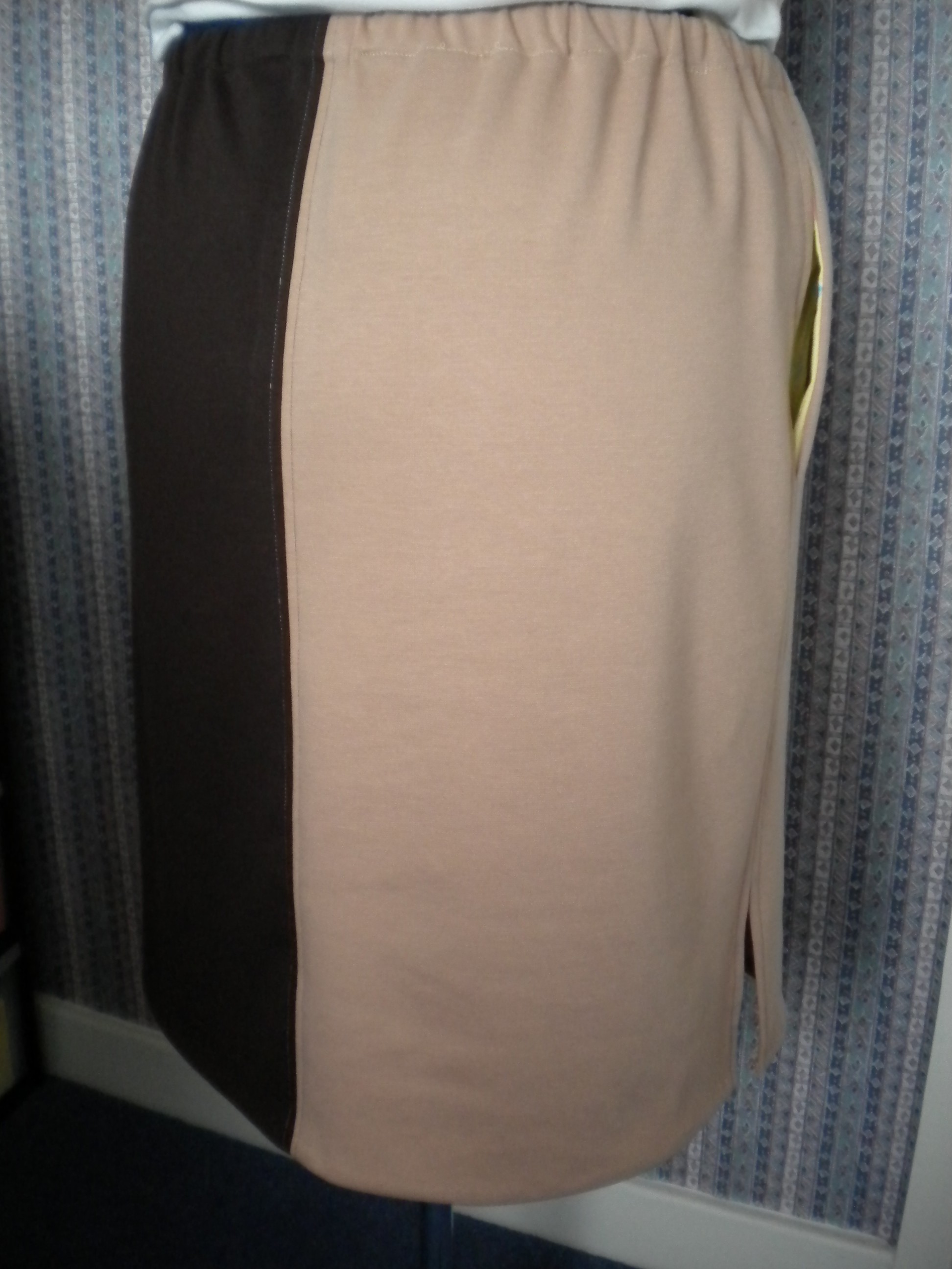I hoped I had sufficient salmon and khaki coloured jersey left over from the Marcy Tilton dress to make a skirt from Butterick 3460, a pattern that I have used for casual wear on several occasions. It turned out that the denim skirt that I took to Australia was one of my most worn items. Well, I didn’t have quite enough khaki, so I went off to Barry’s to remedy the situation. They have sold out of khaki and may not get more supplies, so I bought the brown instead, for the sum of £3.00 something, making that the total cost of the skirt, as I already had all of the other notions.