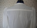 I have decided that I enjoy ‘constructing’ clothes – matching this dot to that dot; folding here and gathering there. At least I enjoy it if all of the dots and lines to cut are clear. And these were all clear, all carefully marked, as advised by Vie Millard in the magazine (although I would do that anyway) and then all carefully matched, especially at the point where the tie and the blouse front meet / part company. And it all came together really well and looks clean, crisp and rather romantic. I found some nice pearl buttons on the market, and had some white lace in stock, which I used on the yoke edges. It looks lovely.