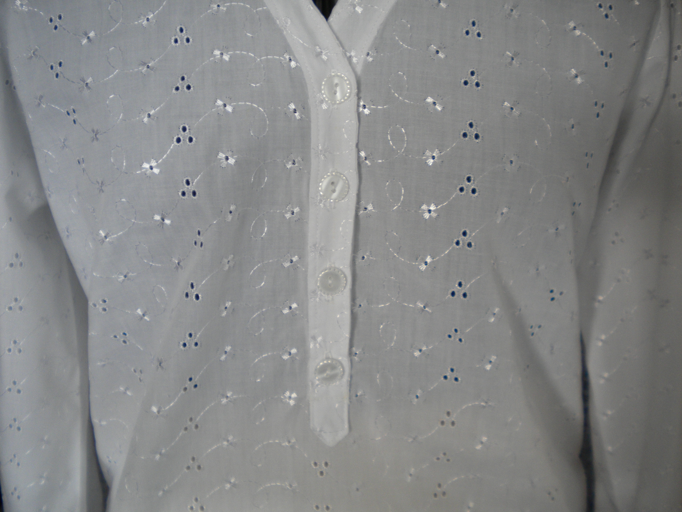 The first version was incredibly difficult to make, as I couldn’t mark anything, thanks to the fabric design, and its one of those patterns when all the dots need to be carefully matched. So a relatively plain white fabric from Minerva Crafts stood a much better chance. And yet, somehow , the multi-coloured, slightly slippery fabric, if anything, has come together better than the clearer marked and matched white fabric. Or maybe it just hides a multitude of sins! There are a few differences between the two. Given that the joy of broderie anglais is to show off the patterned fabric, this one has:
