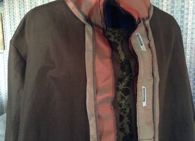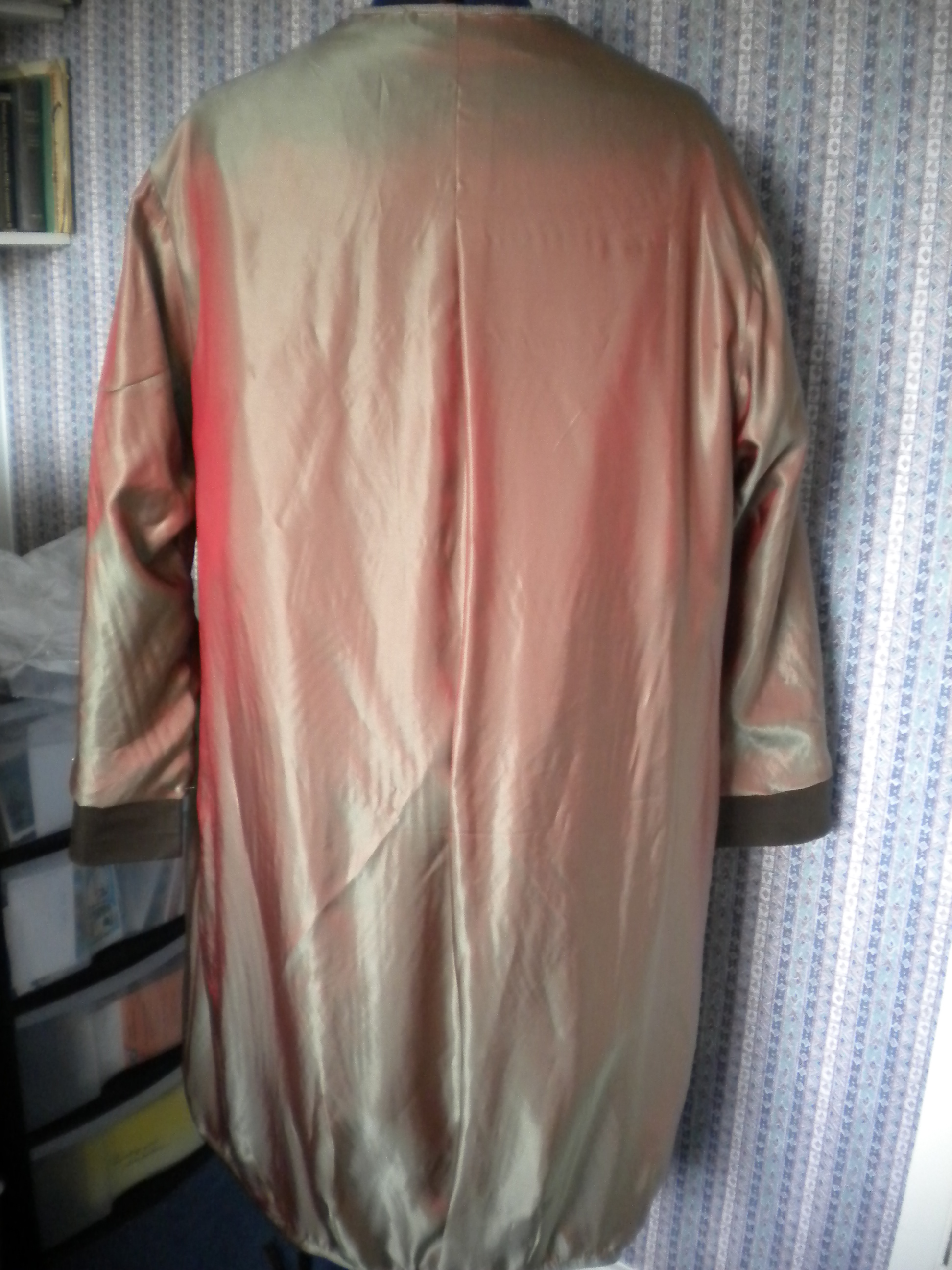 Here it is with its pleat in the back, on my dress form. I also used that to get the length about right, over a Marcy Tilton dress that works wonderfully well with the coat. Isn’t that red / green sheen just lovely?