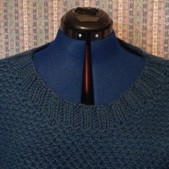 As with my previous knit, I forgot to change the needle size after the ribbed band on the back, so deliberaltely did the same thing on the front. I got it right on both sleeves! I don’t think it matters.