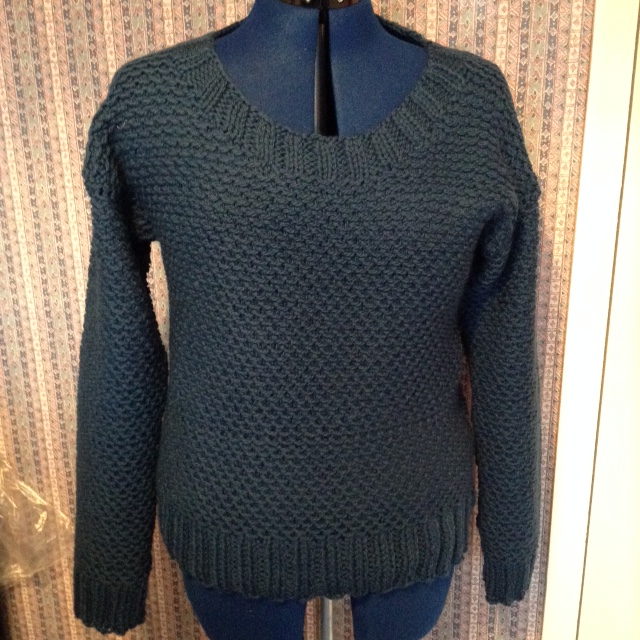 How to knit the neck band? especially as I have read blogs and books that talk about picking up stitched being a scary process – maybe like setting in sleeves for a sewist, which, i’m pleased to say, I don’t find scary. That fact encourages me. The neck band knitting was made all the more puzzling as I had sewn both shoulders together and therefore had a round object that would clearly be a problem to knit on straight needles. So off I went to my chief source of advice for knitting matters – the staff at Guthrie-Ghani (Thanks Rachael)- and came out with suitably sized needles for knitting in the round. And here is the result, of which I am really proud!