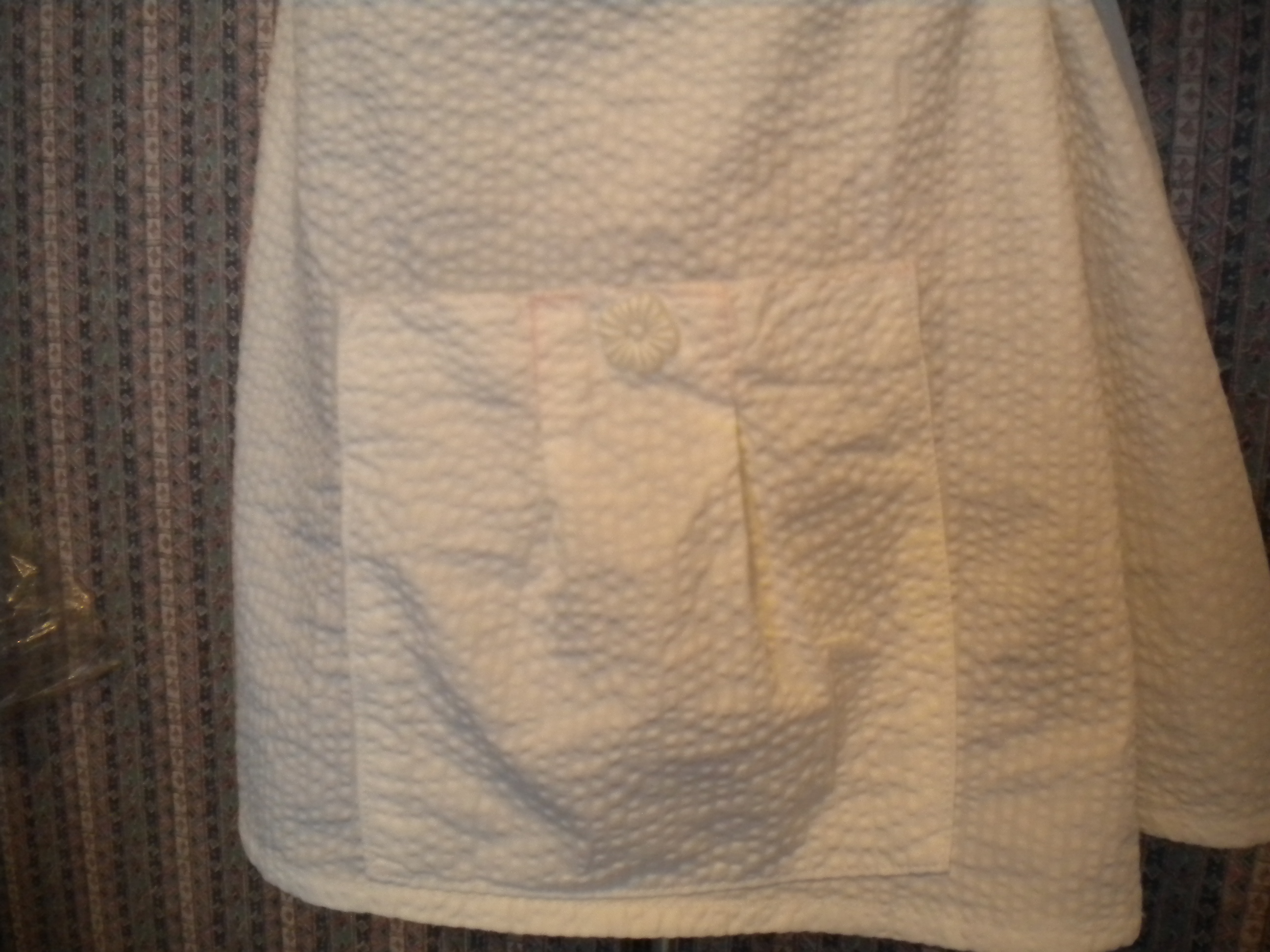 I had some nice while flower buttons in stock. One is used to fasten the back neckline. One is positioned below the front neckline, and the other two adorn the pockets. You will note that the effect is subtle!