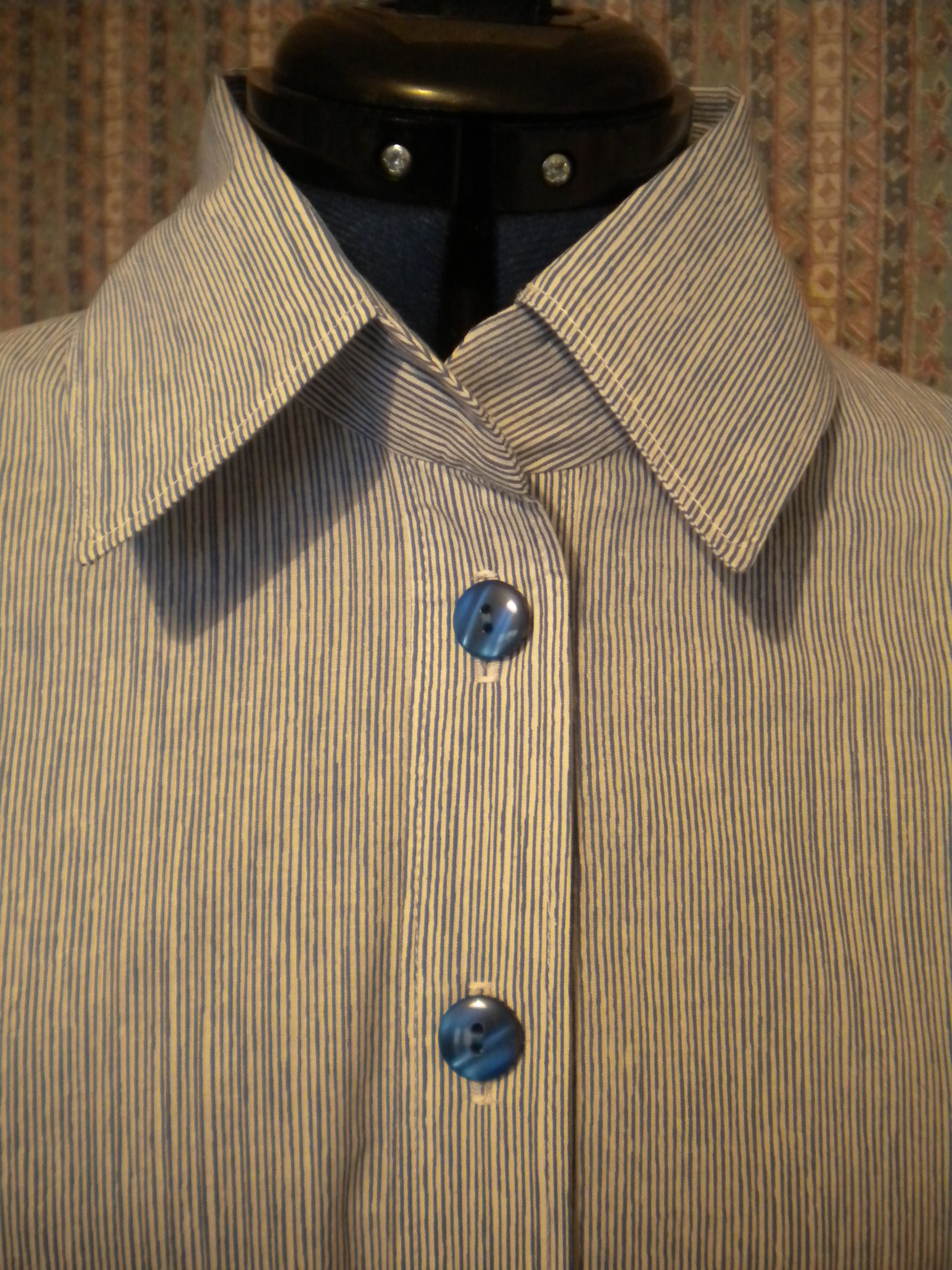 This is my second make from NEC purchased fabric. Its John Louden fabric from Fabrics Galore. I was looking for chambray for a shirt dress, but decided that this was just a little bit unusual and would be different. Everyone else is wearing chambray or denim. It may look like blue stripes, but the stripes are uneven, meaning that there is no pattern matching to worry about.