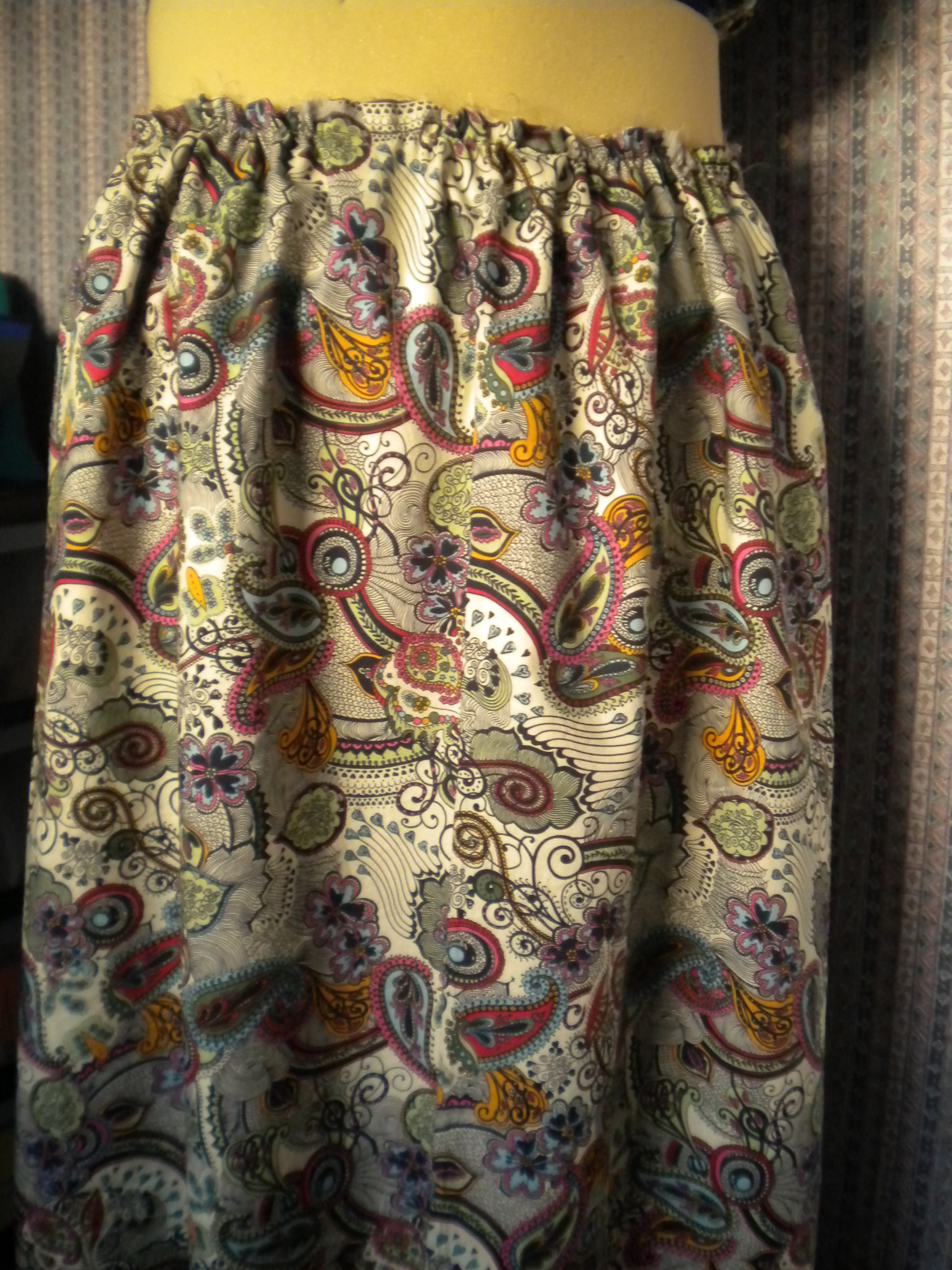 I lined the skirt with some relatively inexpensive gold lining from Fancy Silk Store, and pretty much drafted a waistband to fit. I borrowed the band width from a skirt pattern, but that’s all. Noting that the fabric would drape and fold nicely when it was gathered, I wanted to be sure that the lining would not affect this in any way. The original pattern is not lined. I sewed the two skirts separately, and then attached the skirt to the lining at the waist, and pulled the threads….. then I let it all hang for a while.