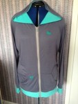 Blue denim trousers, purple and brown raglan sleeved top, zip up jersey jacket, and later on, Liberty jersey top and brown cardi.