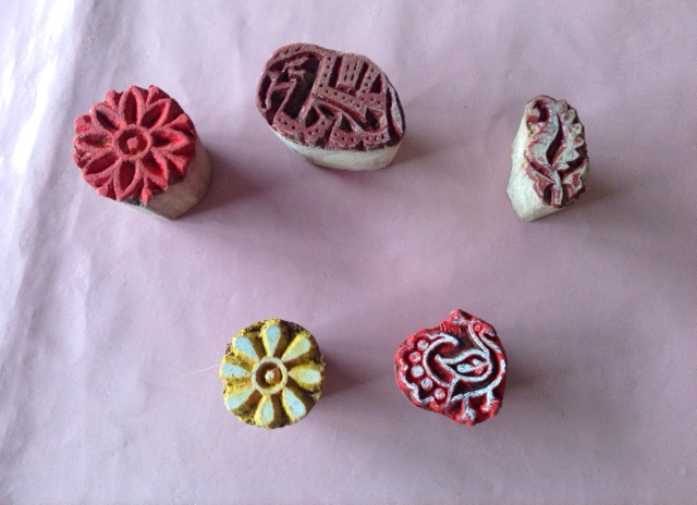 I bought to fabric printing blocks in Udaipur, Rajasthan. Using my fabric paint, I had tested them on a simple pillow case previously, and then gave up! So first I tested on some scrap fabric and then I ‘did’ the pockets. They could always be re-cut if necessary….