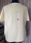 Also, the paint has not adhered to the fabric as well as it did when applied directly with a brush, in my tie dyed garment. I left it to dry the requisite 24 hours, then put it into the tumble drier for about 15 minutes, and then washed it. By the time it was back on the ironing board, some of the paint was peeling off in small bits. I’ll see how it goes – I could top it up ‘freehand’ if it becomes a problem.