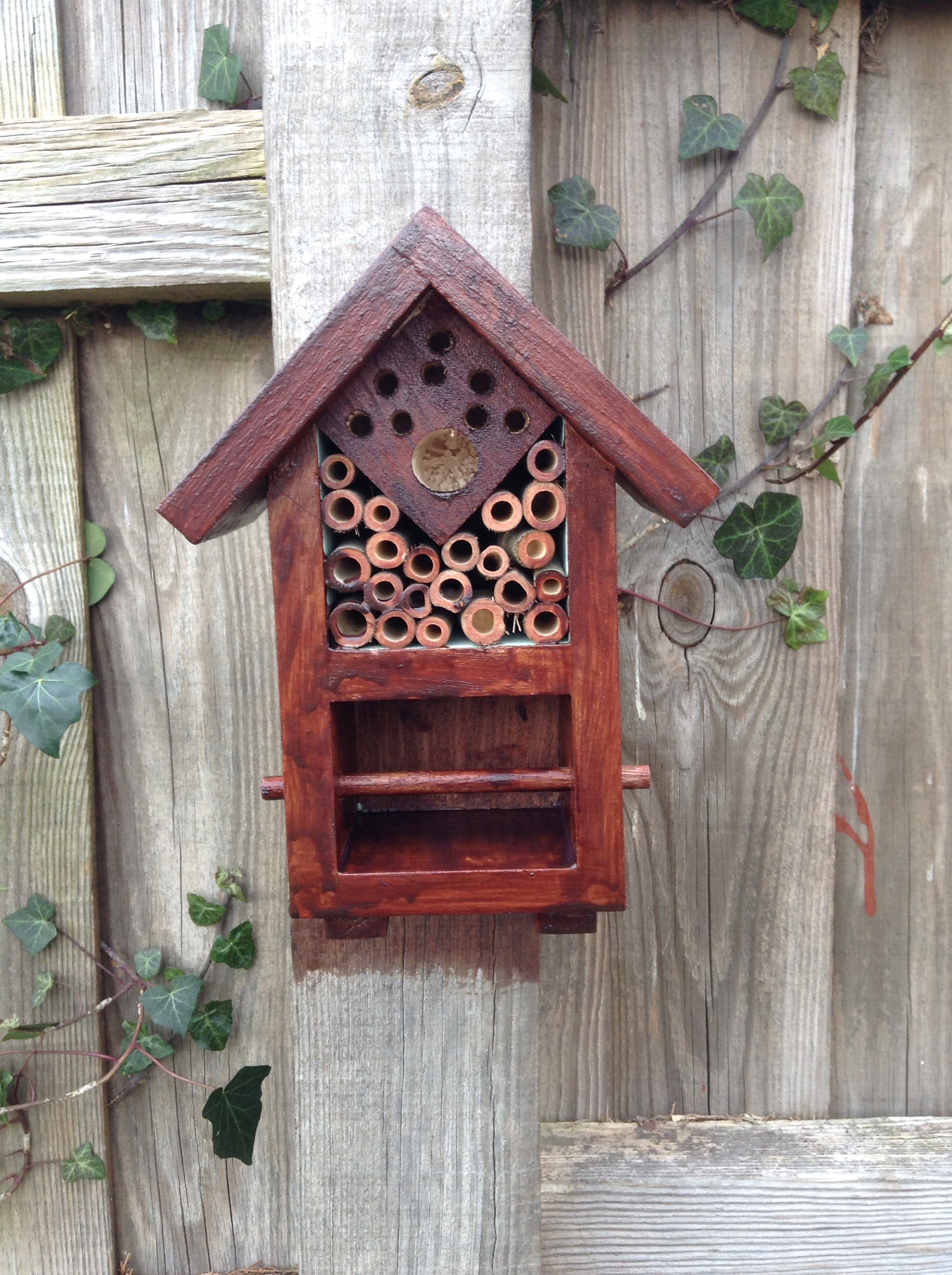 There has been a bit of a tidy up in my back garden in the last year. Basically the furthest section from the house is a bit wild, mainly because there is steep drop. For the last 20 odd years it’s all been obscured from view by a large tree, which I had cut down last July. So now I can see the wild part of the garden, and decided that I would turn it into a mini wildlife reserve – which is grand way of saying that I got a bee box for Christmas, which is now in position and ready for baby bees  next year.