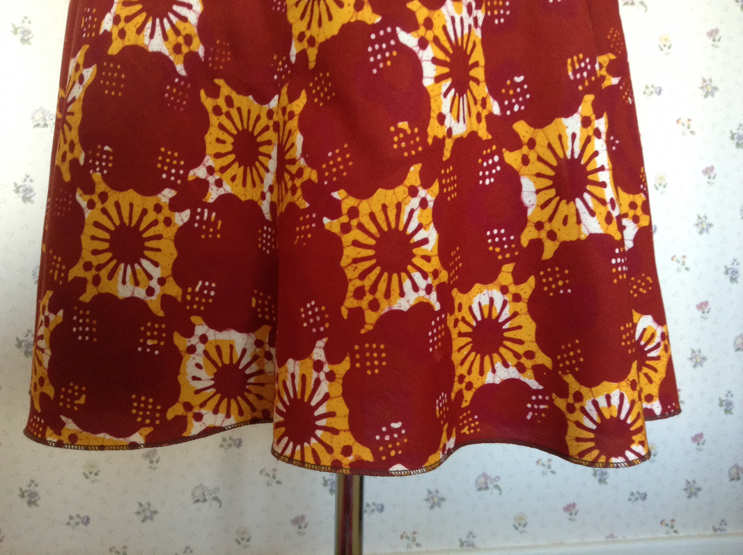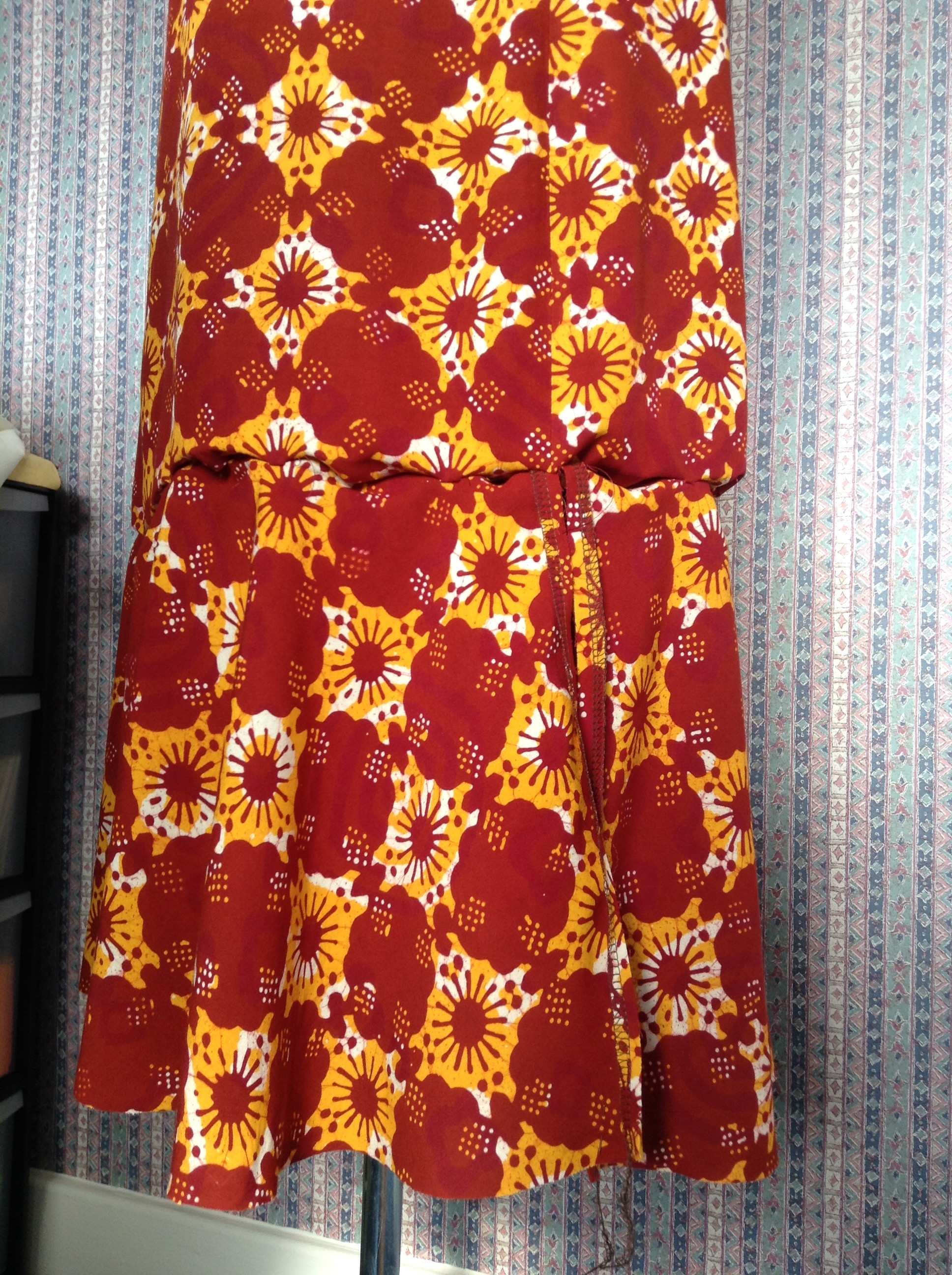 The skirt side seams didn’t hang right either. I’m not sure why not, as the toile hangs perfectly. But then the toile is made from cheap polycotton; not irreplaceable dyed batik cotton. I unpicked the side seams 3 times and stitched the waist 2 1/2 times.