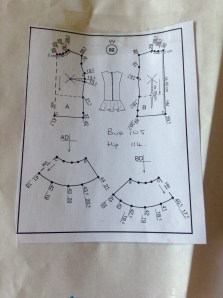 I chose the Lutterloh patterns from which I made a toile on my course earlier in the year. It is good for showing off the fabric, but not straight up and down, so that fitted the bill nicely. However, from a risk point of view, it meant that I was using fabric which I couldn’t replace, and effectively, no pattern instructions. “Right first time” seemed to be the order of the day. This is all the pattern that I have……