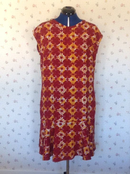 How to finish the hem? A lot of patterns don’t tell you exactly how to finish the hem, so maybe this isn’t a problem deriving from Lutterloh. The fabric hangs well, and I didn’t want to spoil that. I used a scrap of fabric and tried 4 different methods of finishing. Clearly the best one was to use a rolled hem on the overlocker. I have used it before for fine fabric, but not on anything this ‘thick’. Now I used a limited range of thread colours with my overlocker. The majority of the time, the results are on the inside, so I use the most appropriate ‘match’. Of course, my colour range does not include a shade of burnt red / orange. In the end I used the brown that I had used inside, and I am pleased that I did, as it is hardly noticeable, especially from a distance. And it was very quick to stitch.
