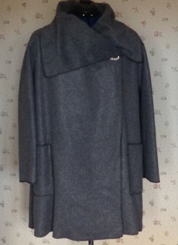 And now to wear it, and see how the drape behaves when it’s fastened in various places. I now have a broach permanently pinned to it to serve as a trial fastening. Maybe it will stay like that. I know that there are some similar coats with fastenings in John Lewis which I will go and study (again) one day, whilst wearing Bianca.
