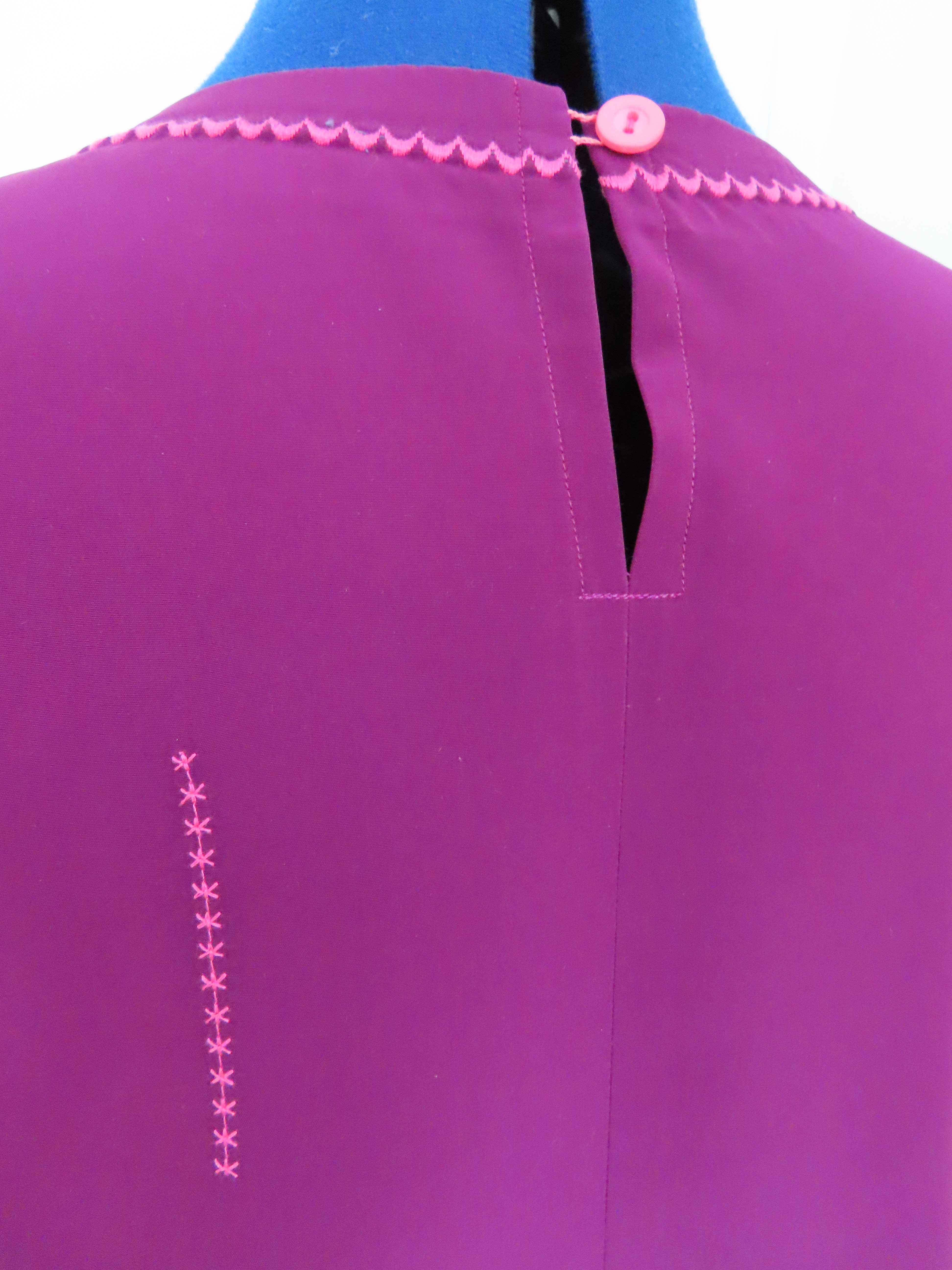 Test, test, test… although if you regularly read my blog, you will know that that is one of my mottos. I already knew that i should back the embroidery with some stabilising interfacing, especially if i was going to stitch round corners and across a variety of grains. This is essential. And the neckline stitching is through the neck binding as well, so more testing needed. I also had to stitch the neck embroidery ‘back to front’, in order to get the scallops facing down the garment i.e. with the fabric to my right, not left as would be normal.