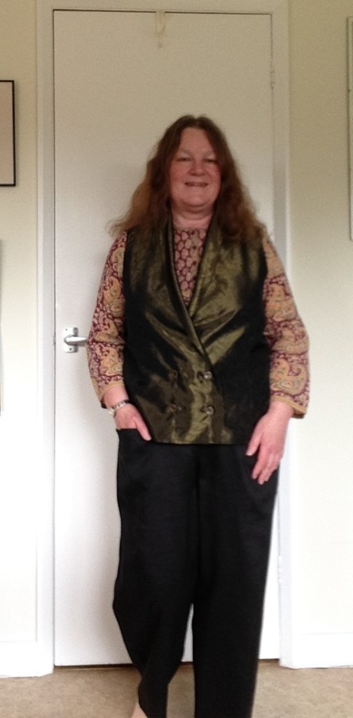 Now this waist coat isn’t going to go with everything. So i decided to have a bit of fun one morning, and see how it could be integrated into the rest of my wardrobe. The magazine pictures suggest that the waist coat could be worn as a stand alone summer top. I’d have to raise the buttons to make that work, or even add a hidden fastening inside the lower part of the collar. It gapes when i lean forwards. I probably wouldn’t wear all of these outfits as photographed, but it allowed me to see how the fit and colour worked with a number of garments.
