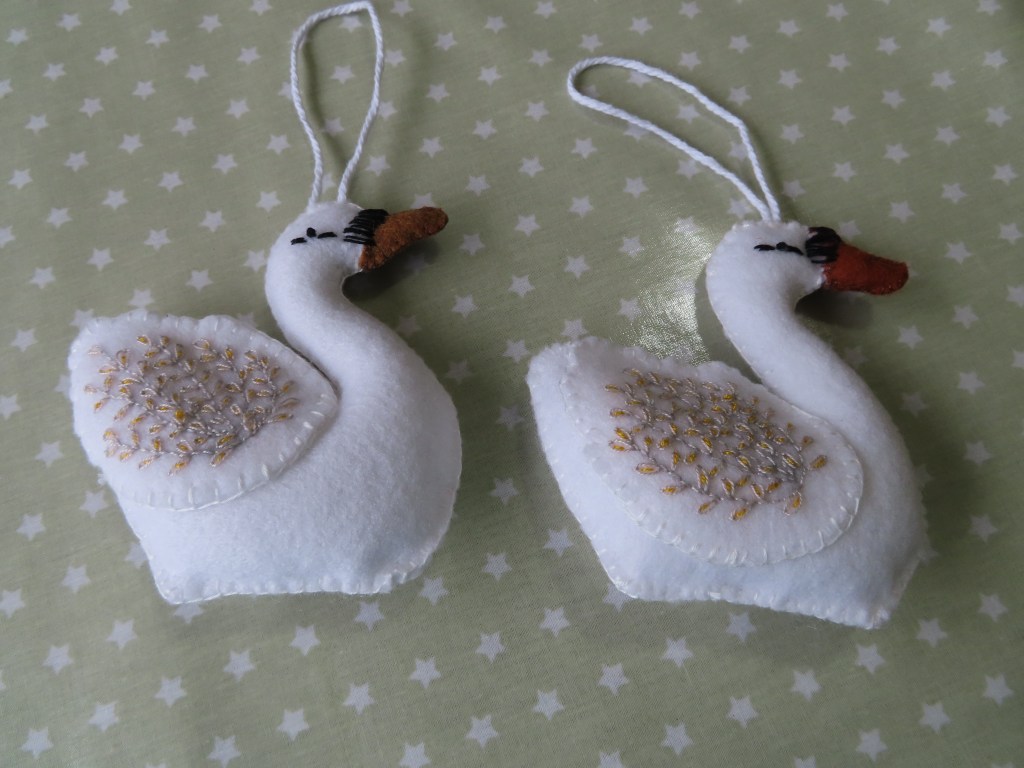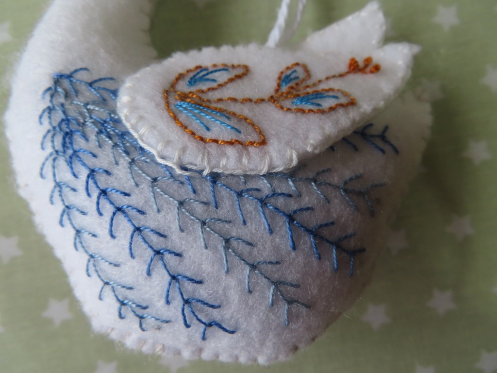 The swan template was given free with Make and Sew toys some months ago. I have previously found some difficulties with incomplete instructions in this magazine, but all of the necessary details were there for this make. It is described as ‘easy’, and whilst it definitely isn’t difficult, the embroidery is delicate and detailed and takes some time to do. I was advised that similar swans at Packwood had taken 8 hours to make. Mine took less time than that, but still maybe 4 – 5 hours. I later identified that the swan pattern was taken from Corinne Lapierre’s book ‘Folk Embroidered Felt Birds’; a book i have known about for a while, but never thought that i needed! The goose was taken from the same book. Other birds at Packwood are variations on the themes in the book, adapted to be colley birds and French hens.
