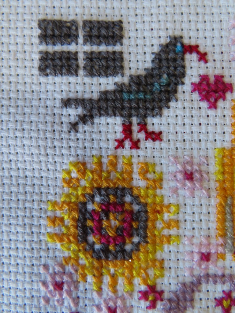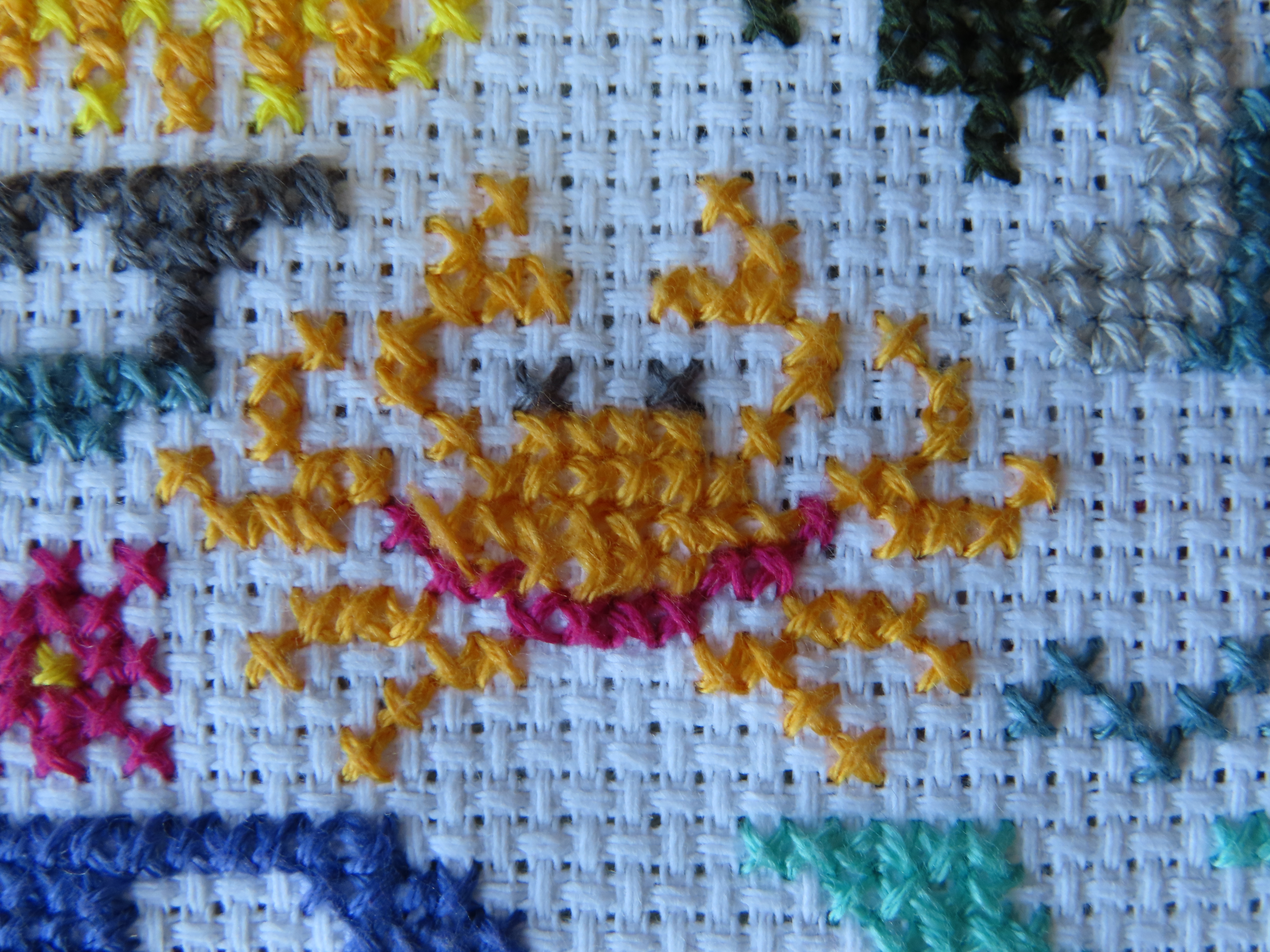 I also tried quite hard to keep all of the stitches going in the same direction. In my case, i opted for bottom left to top right, sitting underneath top left to bottom right. I would say that 95% of the stitches are like this, but i sometimes lost my way going round a corner, and had one particularly bad afternoon, when i was quite distressed about something, and made a real mess of one of the old mine workings! But i did not try to unpick, firstly because its not that easy to unpick lots of stitches, and secondly, it gave the mine working a rough surface, which i thought was appropriate! Then i looked at one of Mum’s pieces and declared it to look 100% consistent with regard to stitch direction. She had lots of practice.