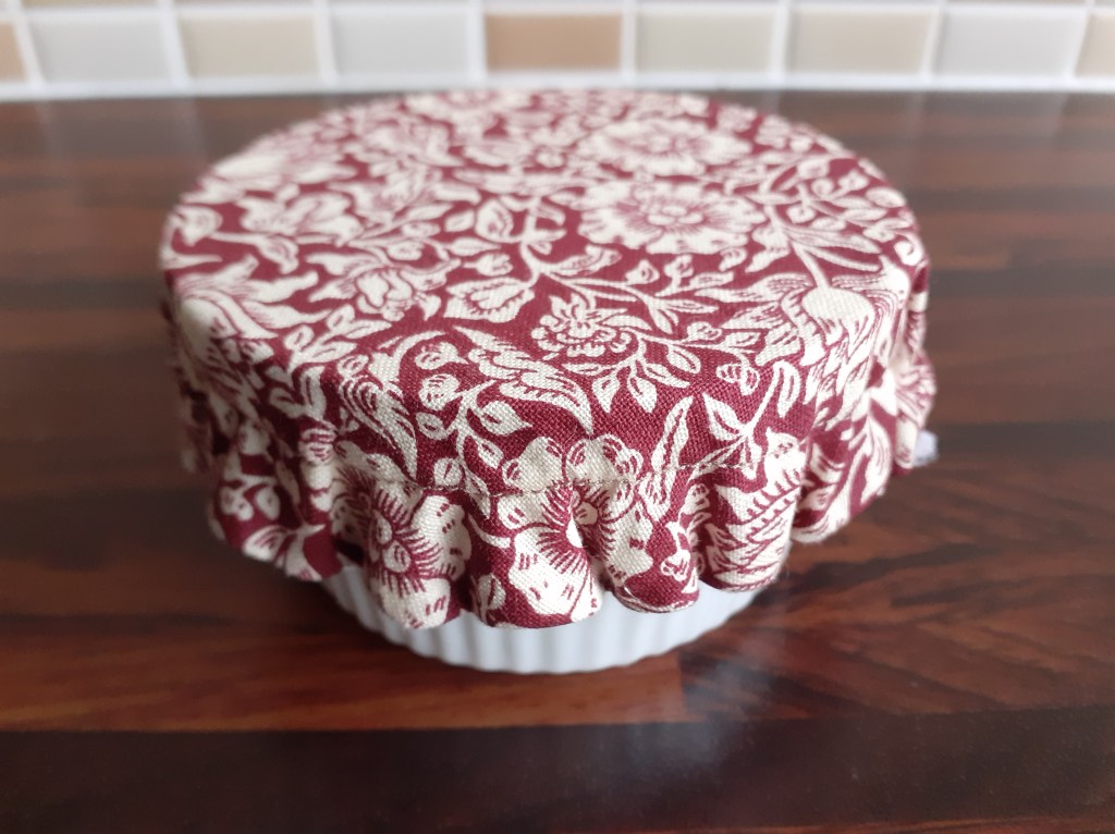 YouTube advice is to take the bowl diameter plus about 8cm as a basis for a circle of fabric. I actually used a compass to draw my circles, and cut out with pinking shears. I then edged the circle with bias binding., through which i threaded elastic. The elastic is tied in several tight knots tightly round the relevant bowl. Done! They take me 20 – 25 minutes each. But i don’t think that you can ‘ad lib’ the sizing. There needs to be a particular bowl in mind when cutting out and fitting the elastic.