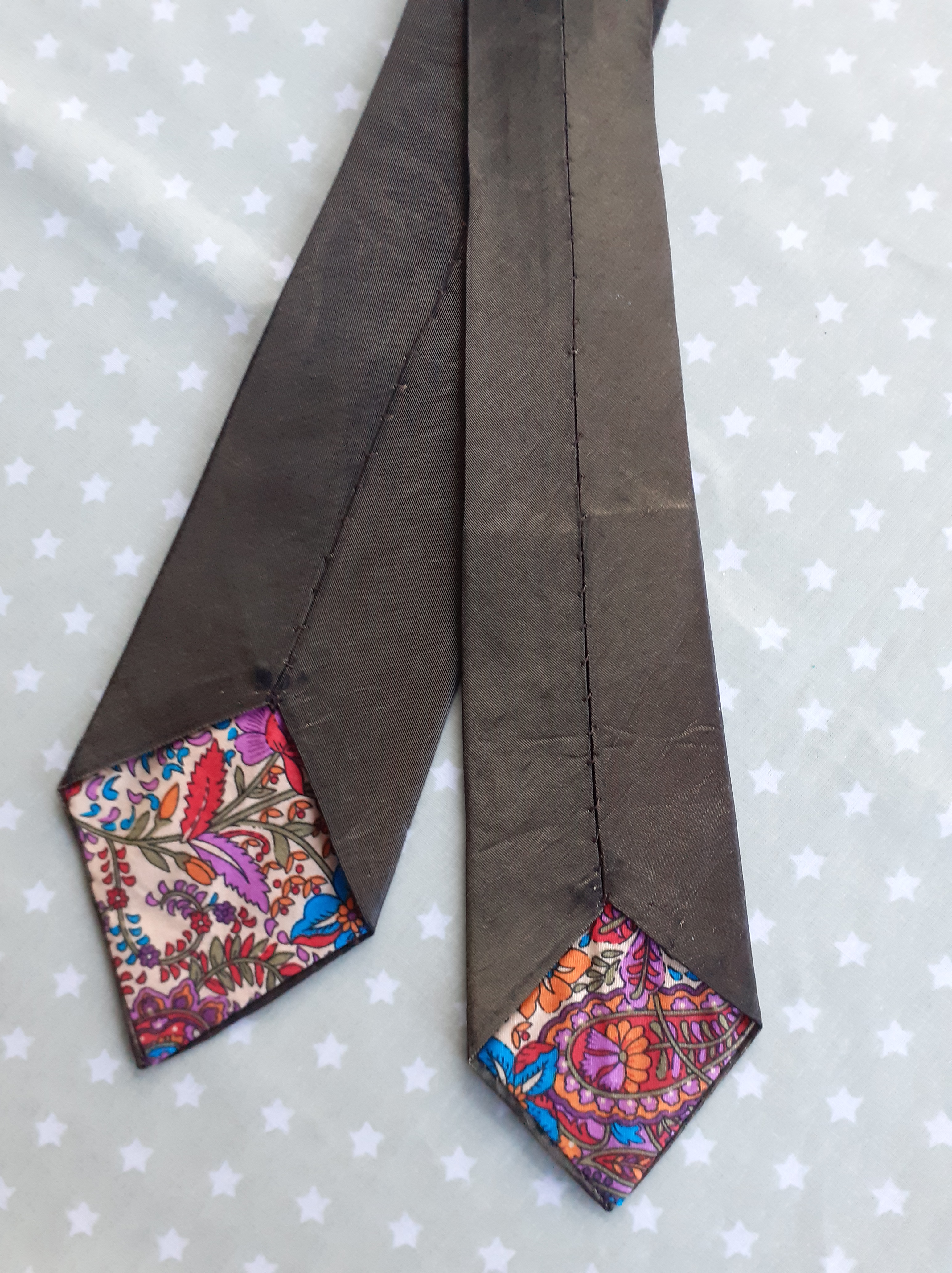 In better news, the rest of the costs of the tie were £0, as i had everything that i needed ‘in stock’. I was gifted some suitable fabric ages ago. I dont know what it is, other than synthetic, but it is just the right weight for a tie. I have vast stocks of left overs, so i used the remnants from a bright summer dress for lining.