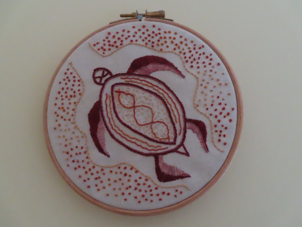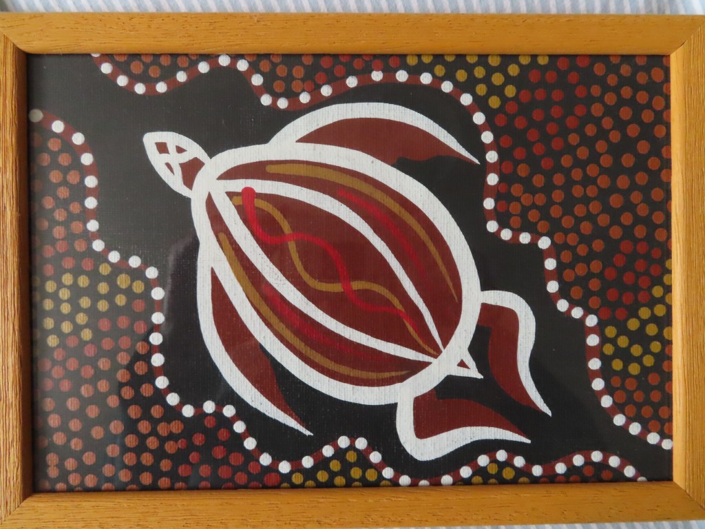 I purchased this piece of Aboriginal art work in Australia 10 years ago. We had been out to sea that day, and seen a turtle on our return journey.