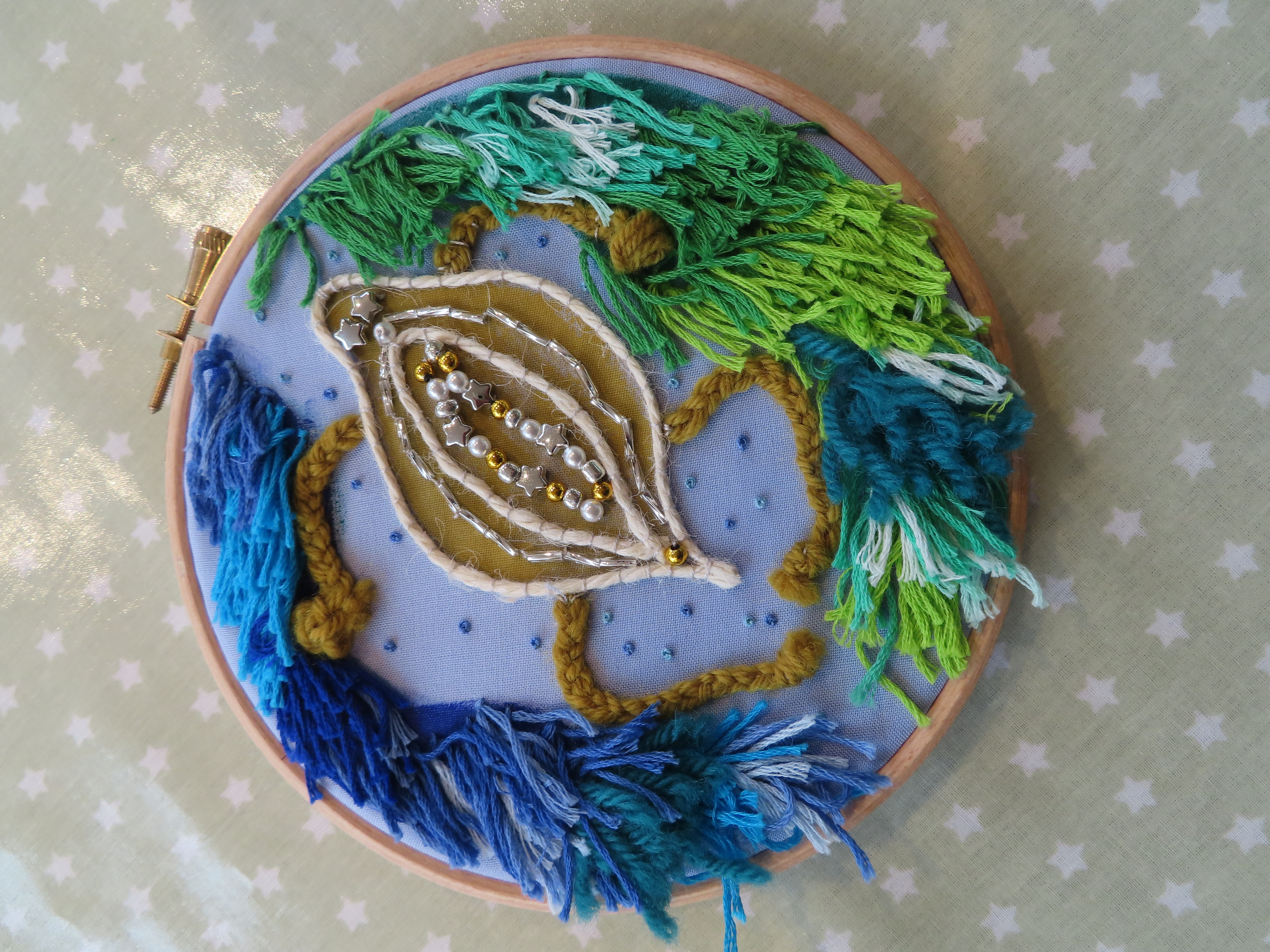 The turtle and areas beneath the seaweed are painted. The basic turtle shape and shell are outlined with couched jute, and then embellished with beads. The legs are made from plaited wool which is couched in place. Then comes the turkey work in a range of colours, mainly using 6 strand embroidery thread. There is some wool in amongst it, but that proved to be very hard to pull through the cotton base, so the majority is thread. A few french knots completed the aquatic scene.